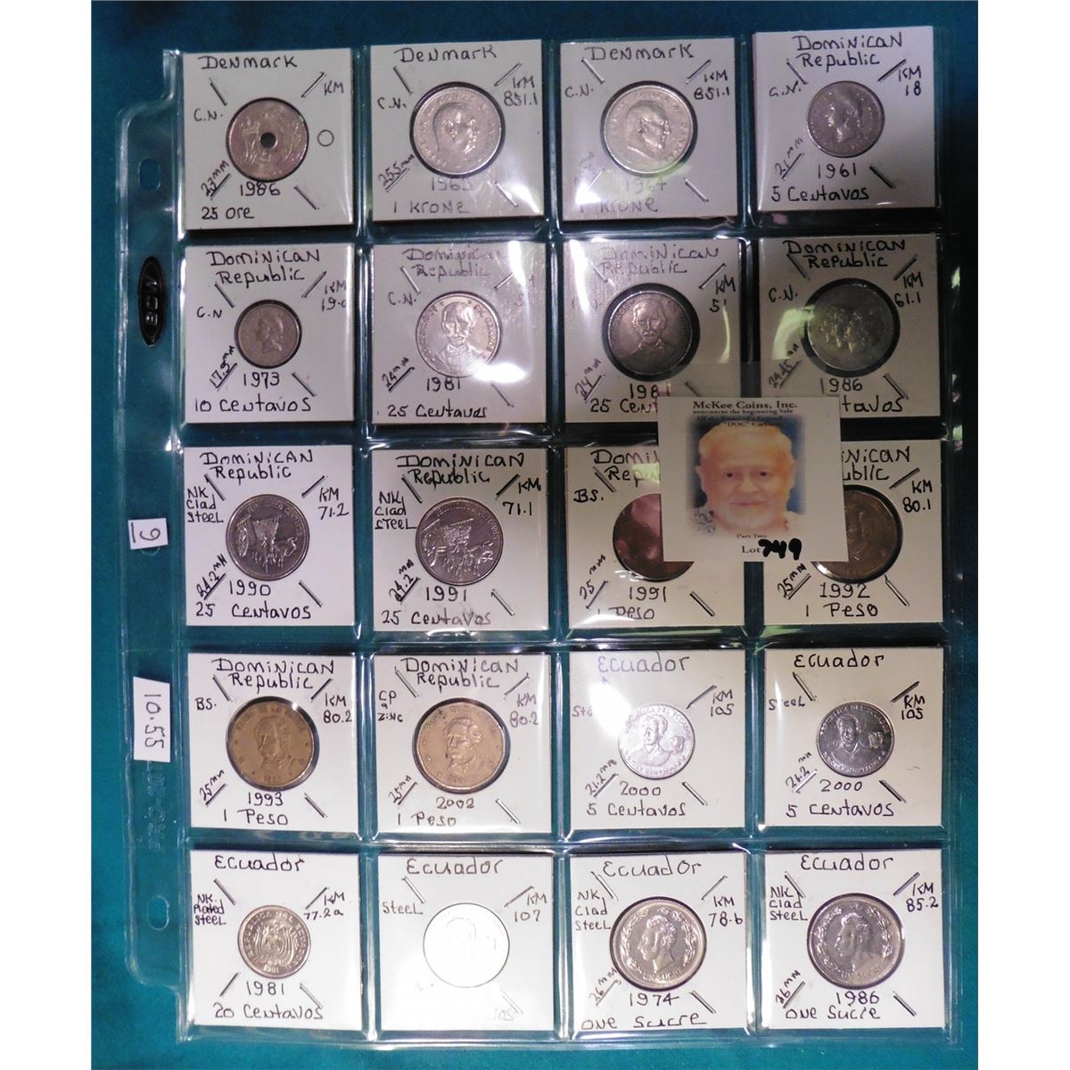(20) Various foreign coins from Denamrk, Domenican Republic, & Ecuador in a plastic page. All identified with KM number, Mintage, and etc. KM Value $10.55.