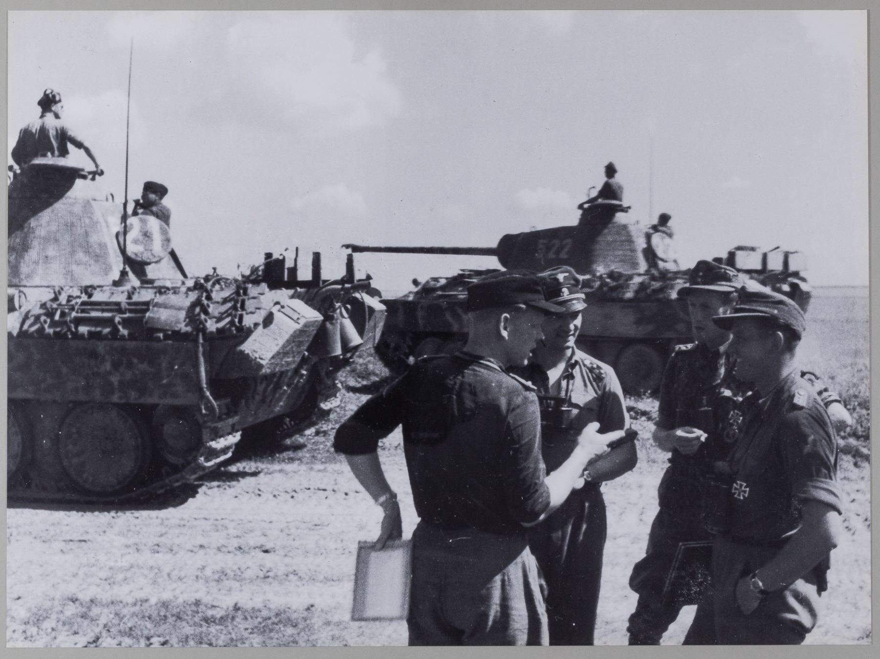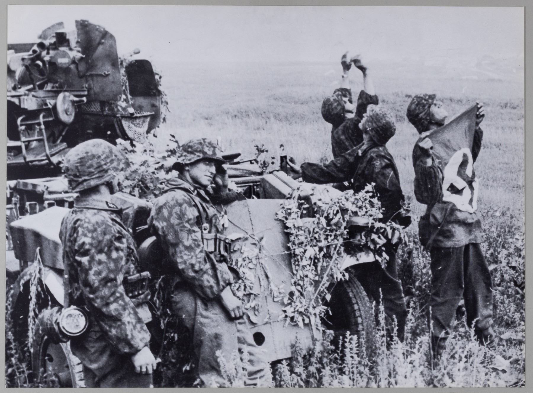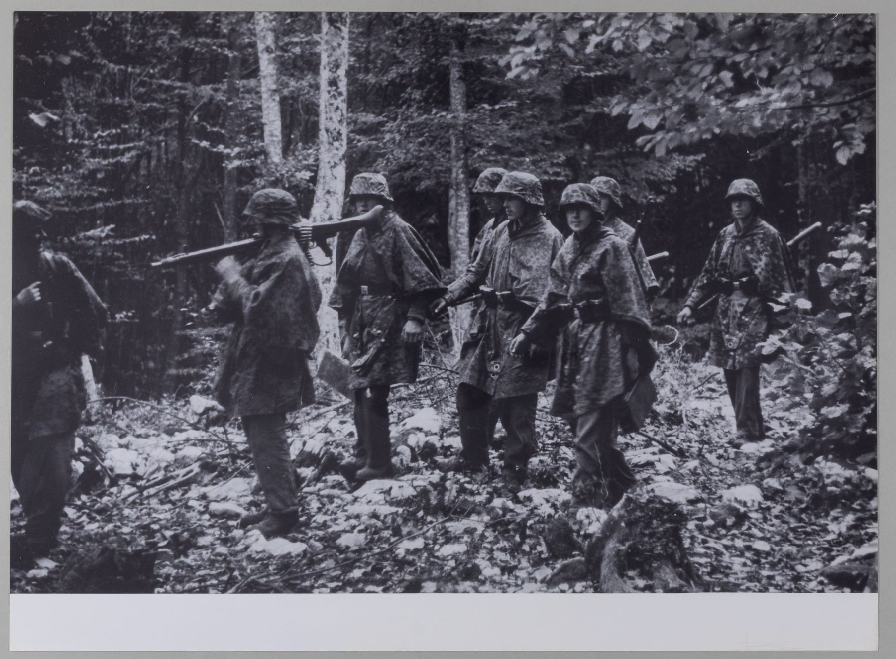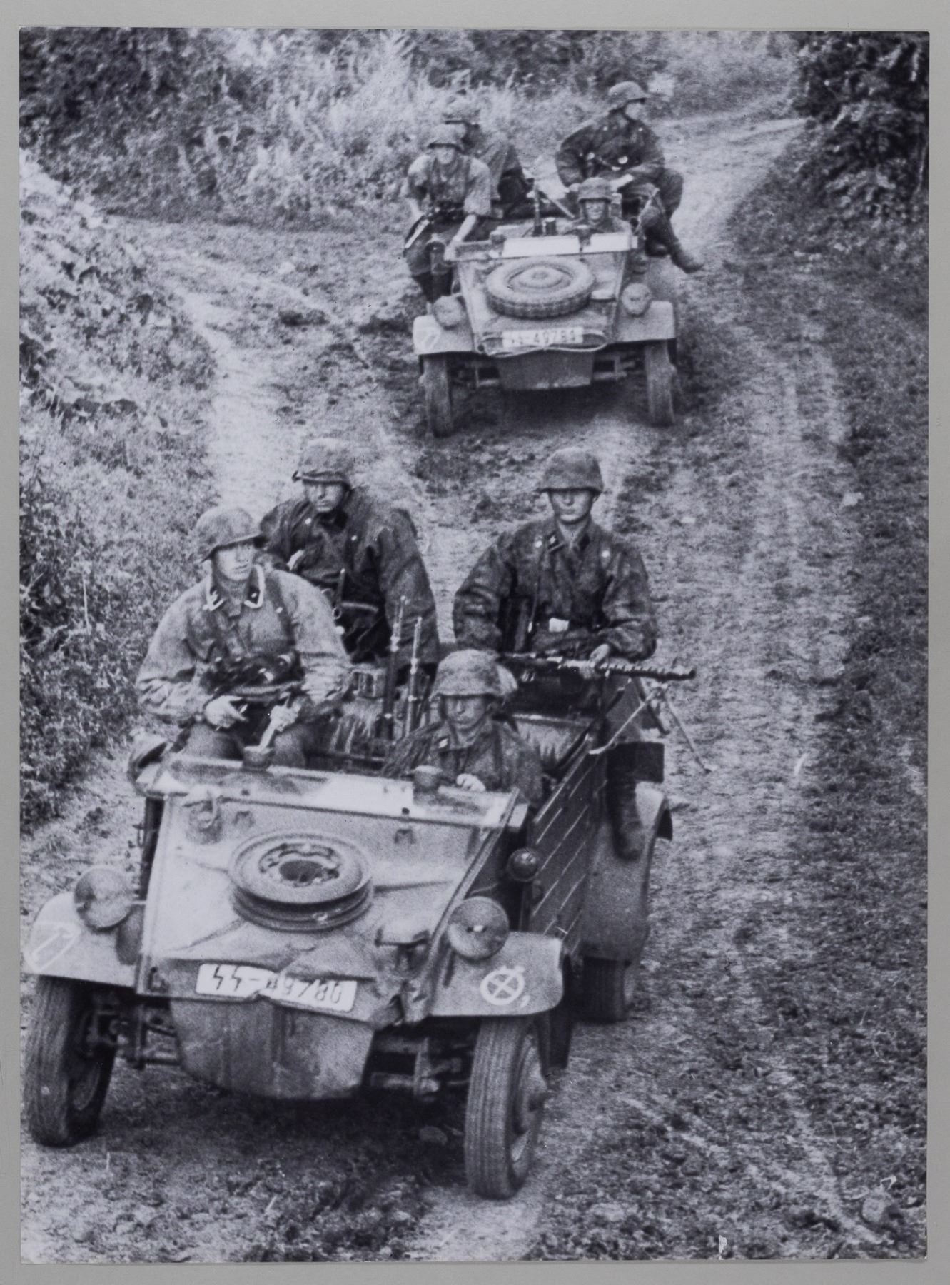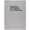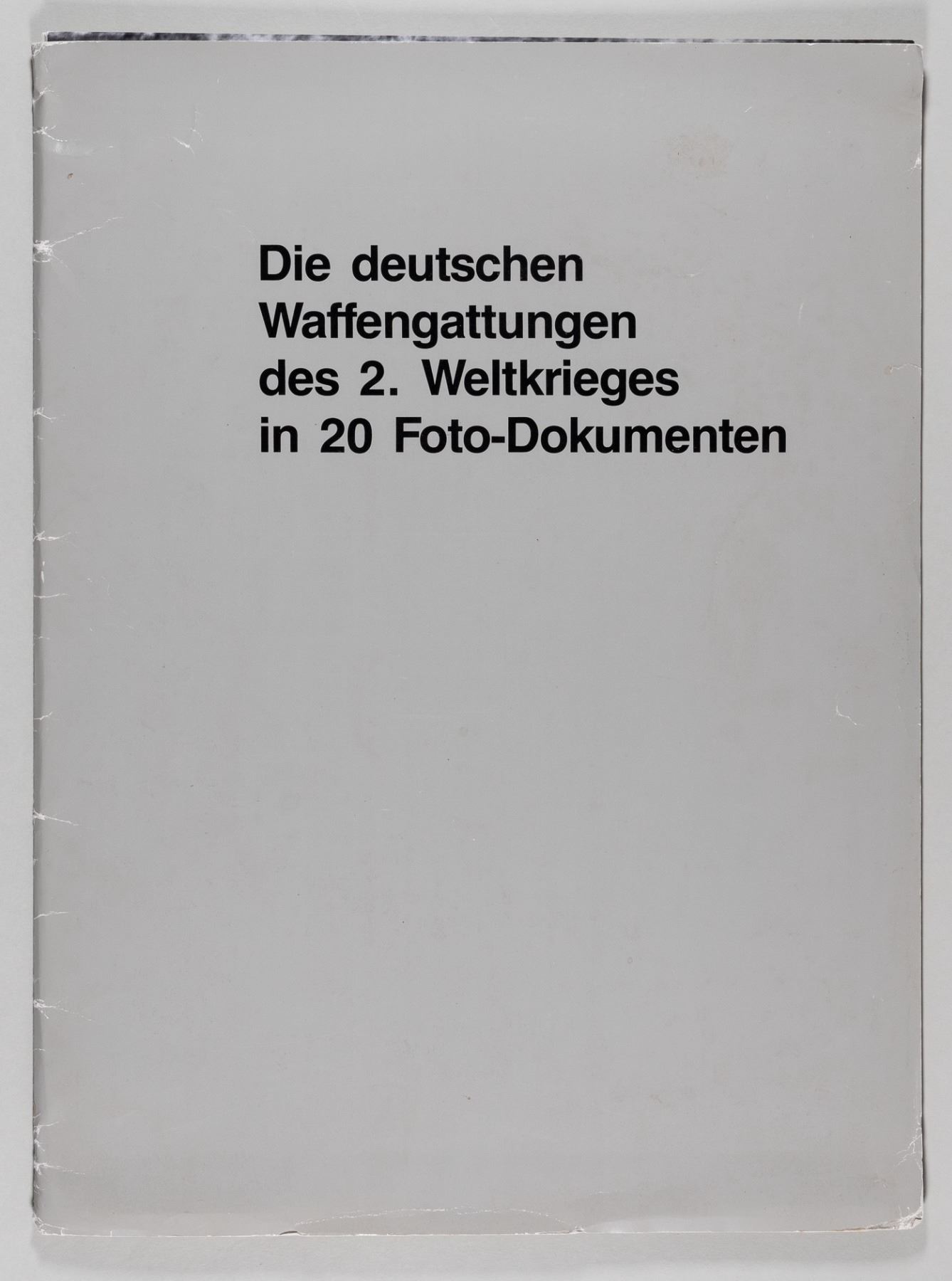 Portfolio of 20 oversized Waffen-SS photographs, reprinted and published by Verlag Nation Europa 'Die Deutschen Waffengattungen des 2. Weltkrieges in 20 Foto-Dokumenten', 15.5 x 11.5 inches. Photos show the Waffen-SS in the field, captions in German and English on the backside. Photographs are overall in good condition, cover shows some wear and bumped corners. Excellent details, great for display.
