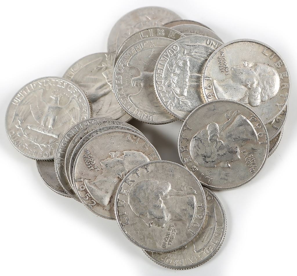 A lot with $5 face value 1964 or earlier Washington quarters. Random dates.