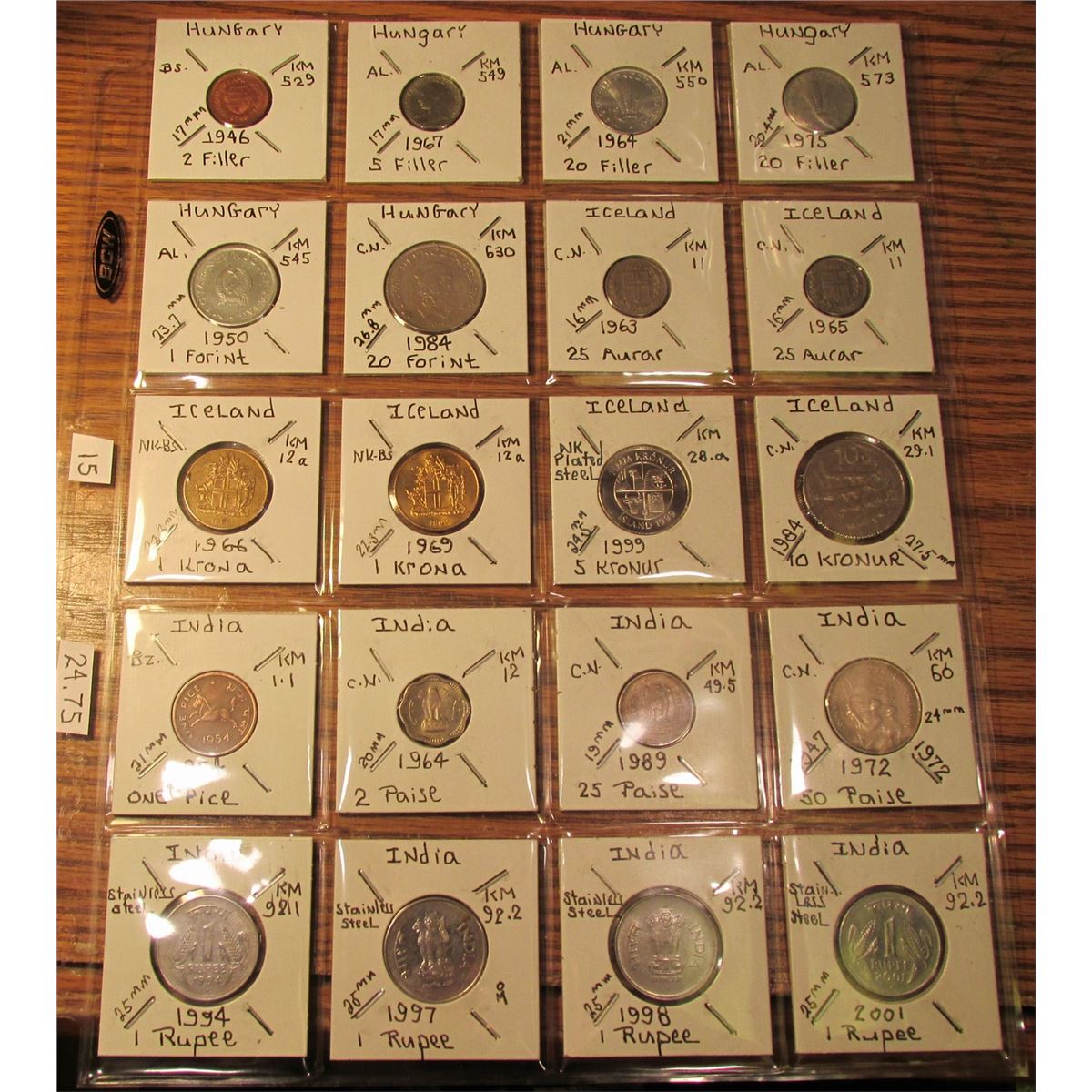 (20) World Coins in 2" x 2" holders and plastic page from Hungary, Iceland, and India. Total Krause
