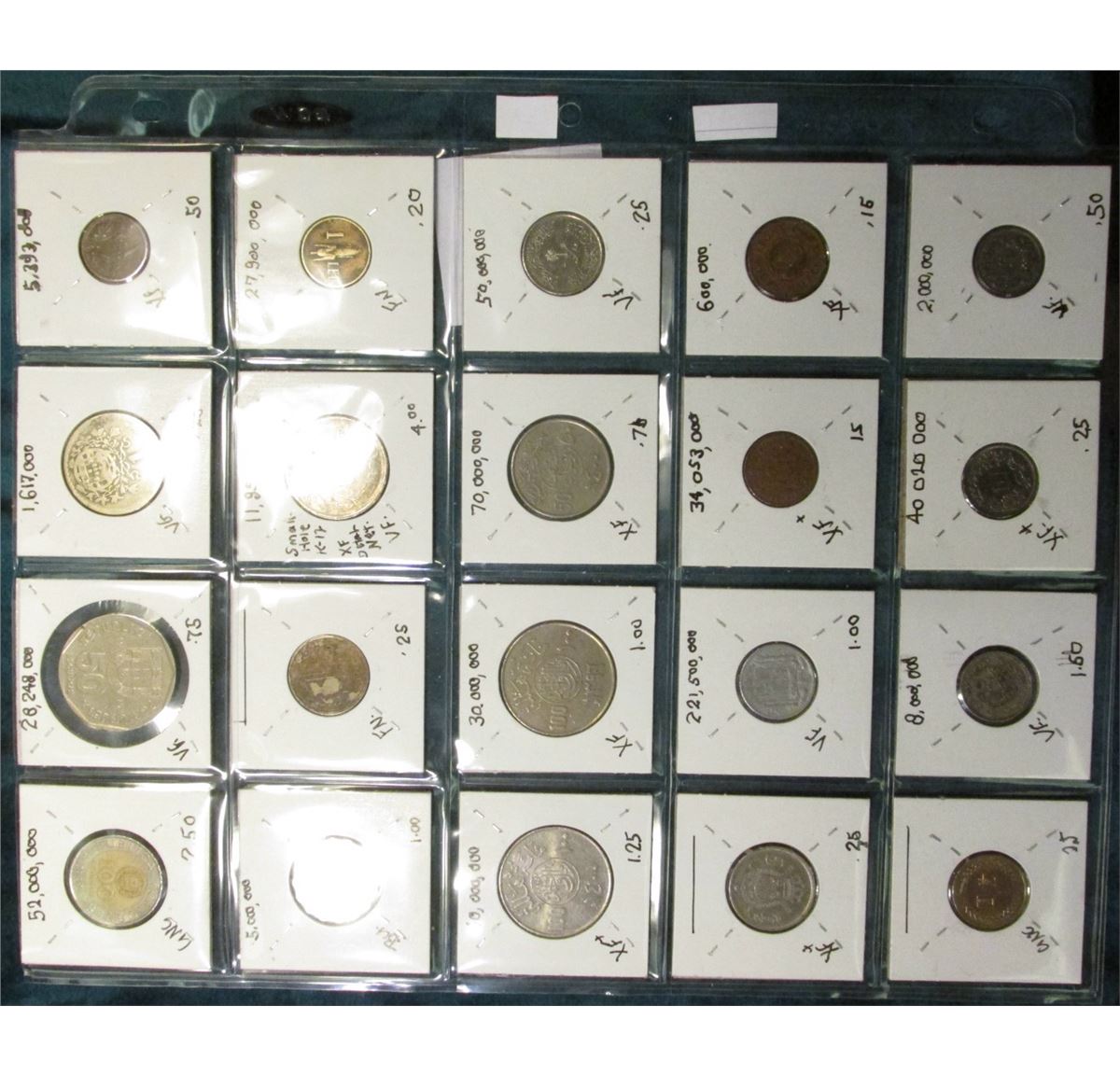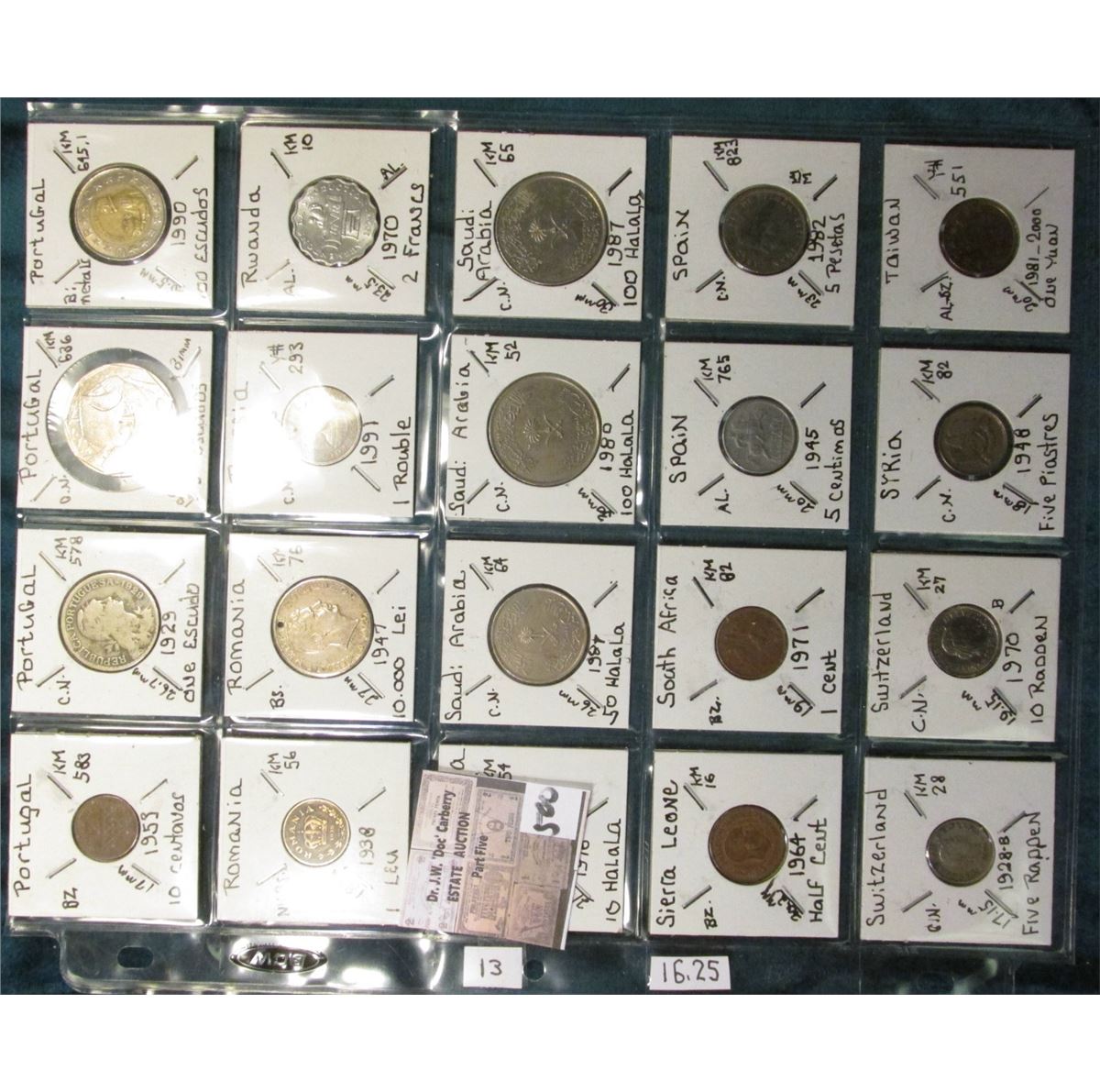 (20) World Coins in a Plastic Page, identified in 2" x 2"s. Includes Portugal, Romania, Russia, Rwanda, Saudi Arabia, South Africa, Sierra Leone, Spain, Switzerland, Syria, & Taiwan. KM Value $16.25.