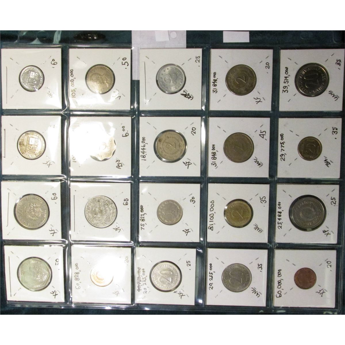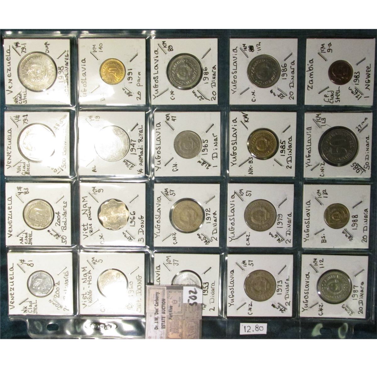 (20) World Coins in a Plastic Page, identified in 2" x 2"s. Includes Venezuela, Viet Nam, Yemen, Yugoslavia, & Zambia. KM Value $12.80.