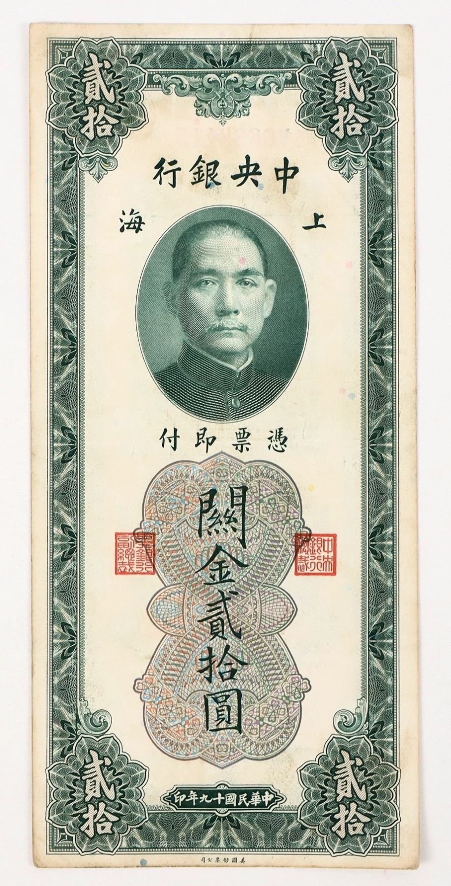 20 Yuan, The Central Bank of China, Shanghai, 1930. Used pay import fees originally. Backed by U.S. dollars until 1935. Obverse is the face of Dr. Sun Yat-sen, first president of the Republic of China. Reverse is the customs house in Shanghai. American BNC printer. VF