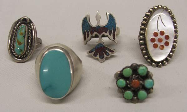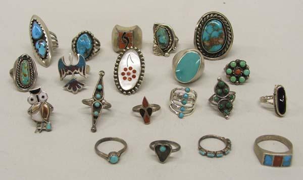 Collection of 20 Navajo and Zuni Silver, Turquoise, and Coral Rings. Largest Ring size 11. SHI $20.