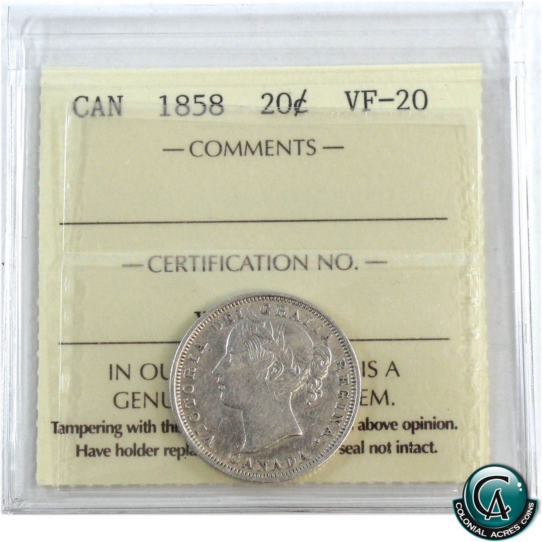 20-cent 1858 ICCS Certified VF-20.