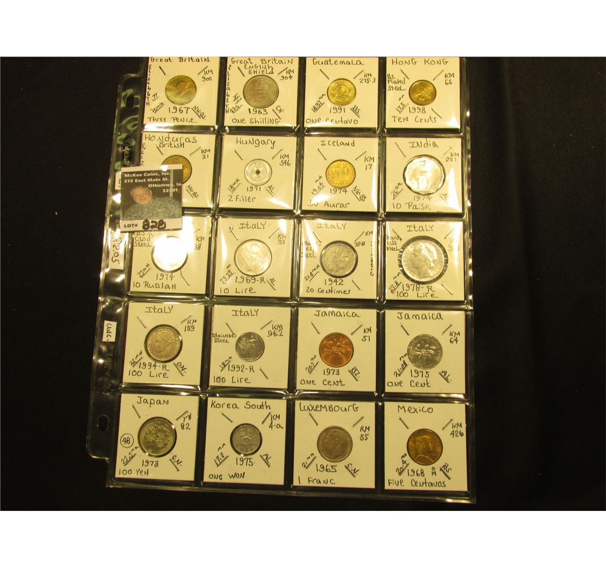 (20) different World Coins in a plastic page, all attributed by KM no., size, denomination, & etc. Includes Great Britain, Guatemala, Hong Kong, Honduras, Hungary, Iceland, India, Indonesia, Italy, Jamaica, Japan, South Korea, Luxembourg, & Mexico. All BU or UNC. KM value $22.95.