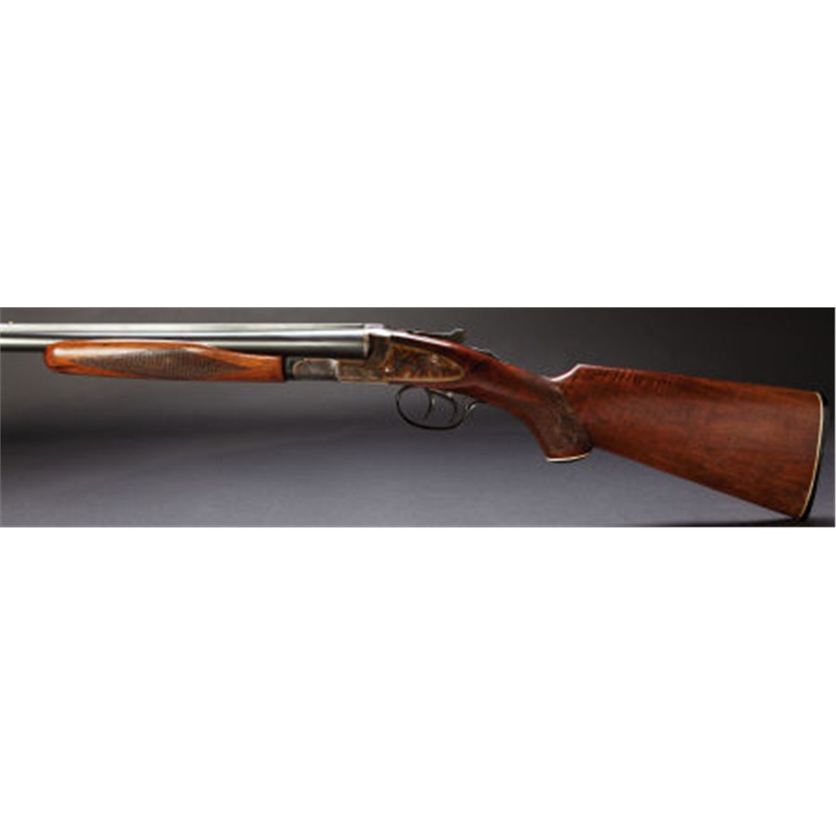 *20 gauge L.C. Smith Field Grade Double Barrel Shotgun. Serial no. FW S 50467. 20 gauge. 28 1/8 inch Armor Steel barrels with matted raised flat rib. Barrel flats marked: 2 3/4 in chamber. Casehardened sidelock action. Extractor. Automatic safety. Checkered pistolgrip stock of slightly figured walnut. Hard rubber grip cap and buttplate. Checkered replacement beavertail fore-end with no recoil lug. Data: Barrel Dimensions: Bores: 0.616/0.621 inches. Chokes: 0.031/0.031 inches. (Full). Chambers: 2 3/4 inches. Proof: Factory Nitro. Stock Dimensions: Pull: 14 1/4 inches. Drop at comb: 1 3/8 inches. Drop at heel: 2 1/4 inches. Cast: Weight: 6 pounds, 14 ounces. Condition: Excellent, as modified. Barrels show 94-96% bluing. Excellent bright bores. Action and locks show 96-98% dark case colors. Triggerguard shows 99% bluing. Stock shows a few light marks. Grip cap shows losses. Replacement fore-end shows a few light marks.