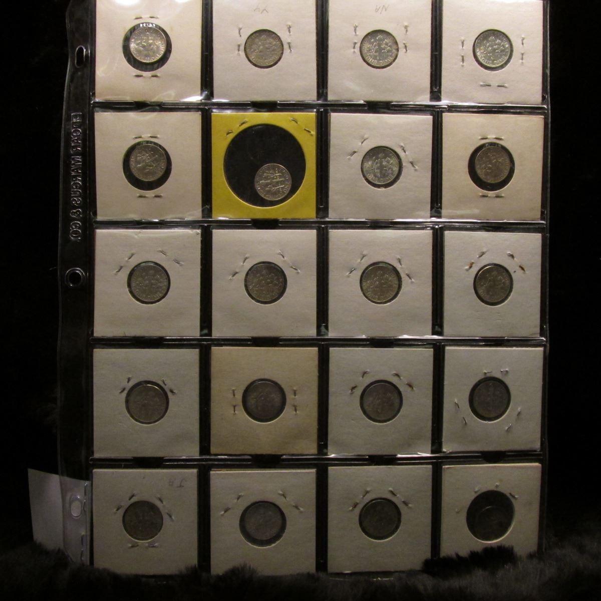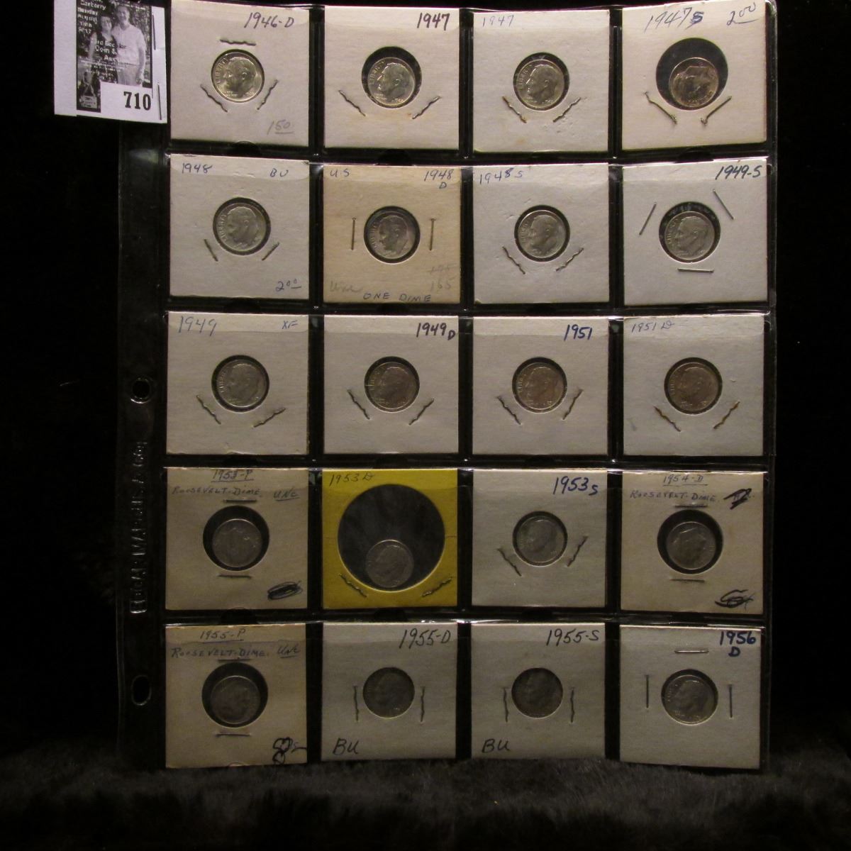 20-pocket plastic page of Silver BU Roosevelt Dimes including dates 1946 D to 1956 D. (20 pcs.).