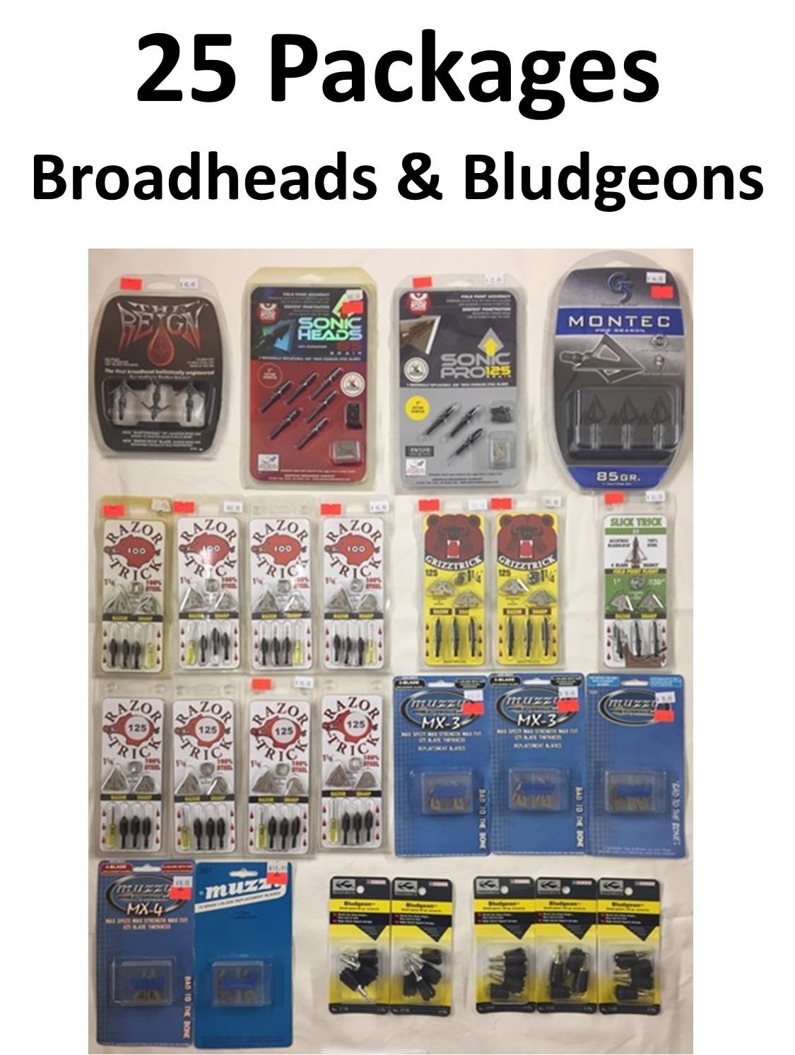 20 x Broadheads & 5 x Bludgeons, 1-Reign 100 Gr, 1-Sonic Head 125 Gr, 1-Sonic Pro 125 Gr, 1-Montec Pre Season 85 Gr, 11 x Slick Trick, 4-Razor 100 Gr, 4-Razor 125 Gr, 2-Grizz 125 Gr, Slick 85 Gr, 5 x Muzzy Replacement Blades 2-MX3-3, 1-MZ-320, 1-MX4-3, 1-MZ-307, 5 x Bludgeons, 3-125Gr, 2-85Gr