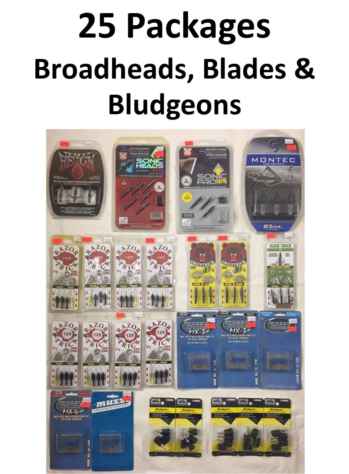20 x Broadheads/Blades & 5 x Bludgeons, 1-Reign 100 Gr, 1-Sonic Head 125 Gr, 1-Sonic Pro 125 Gr, 1-Montec Pre Season 85 Gr, 11 x Slick Trick, 4-Razor 100 Gr, 4-Razor 125 Gr, 2-Grizz 125 Gr, 1-Slick 85 Gr, 5 x Muzzy Replacement Blades 2-MX3-3, 1-MZ-320, 1-MX4-3, 1-MZ-307, 5 x Bludgeons, 3-125Gr, 2-85Gr