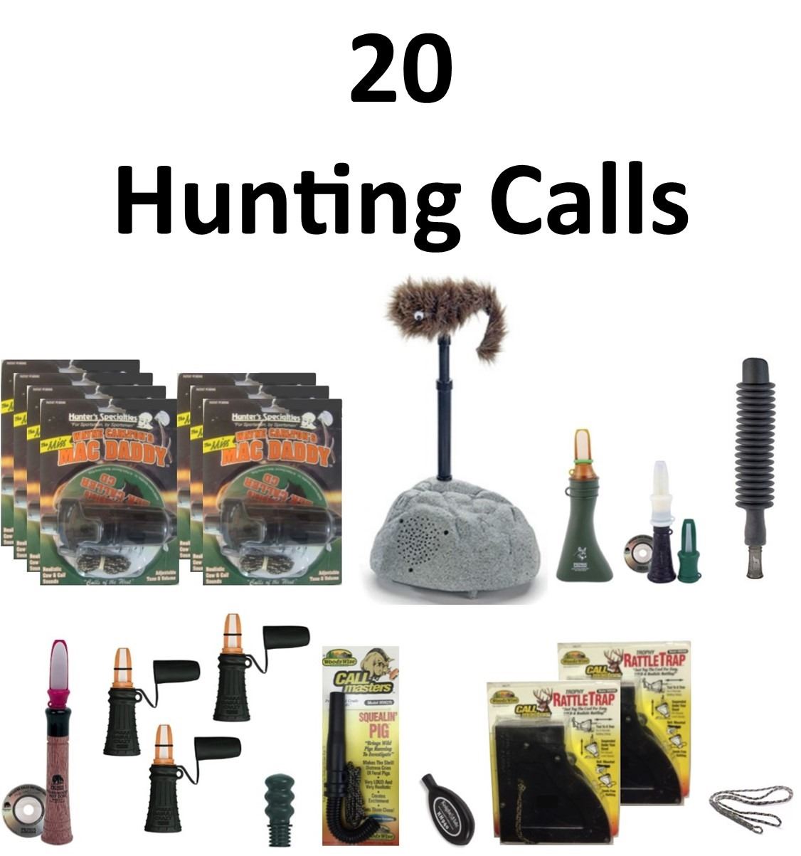 20 x Hunting Calls & 1 Lanyard, All Call, Mini Mag Howler, Lil Dog Call, Dog Catcher, Hardwood Hot Dog, EZY Mouser, Squealin Pig, Mouse Squeaker, 3-Imaka Da Bullcrazy, 7-Miss Mac Daddy Cow Calls, 2-Trophy Rattle Trap, Single Lanyard