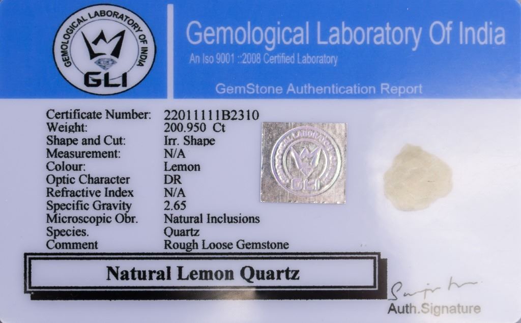 200.95 ct irregular shape rough lemon colored natural quartz. Accompanied with GLI certificate.