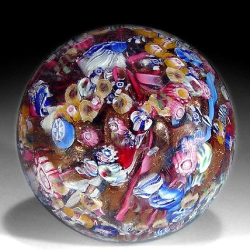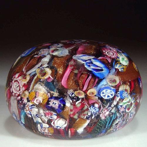 Antique Venetian scrambled millefiori paperweight, with ribbons of copper aventurine, among densely packed complex canes, twists, and filigree. Unpolished base. Diameter 3 1/8". Minor surface wear. NO RESERVE