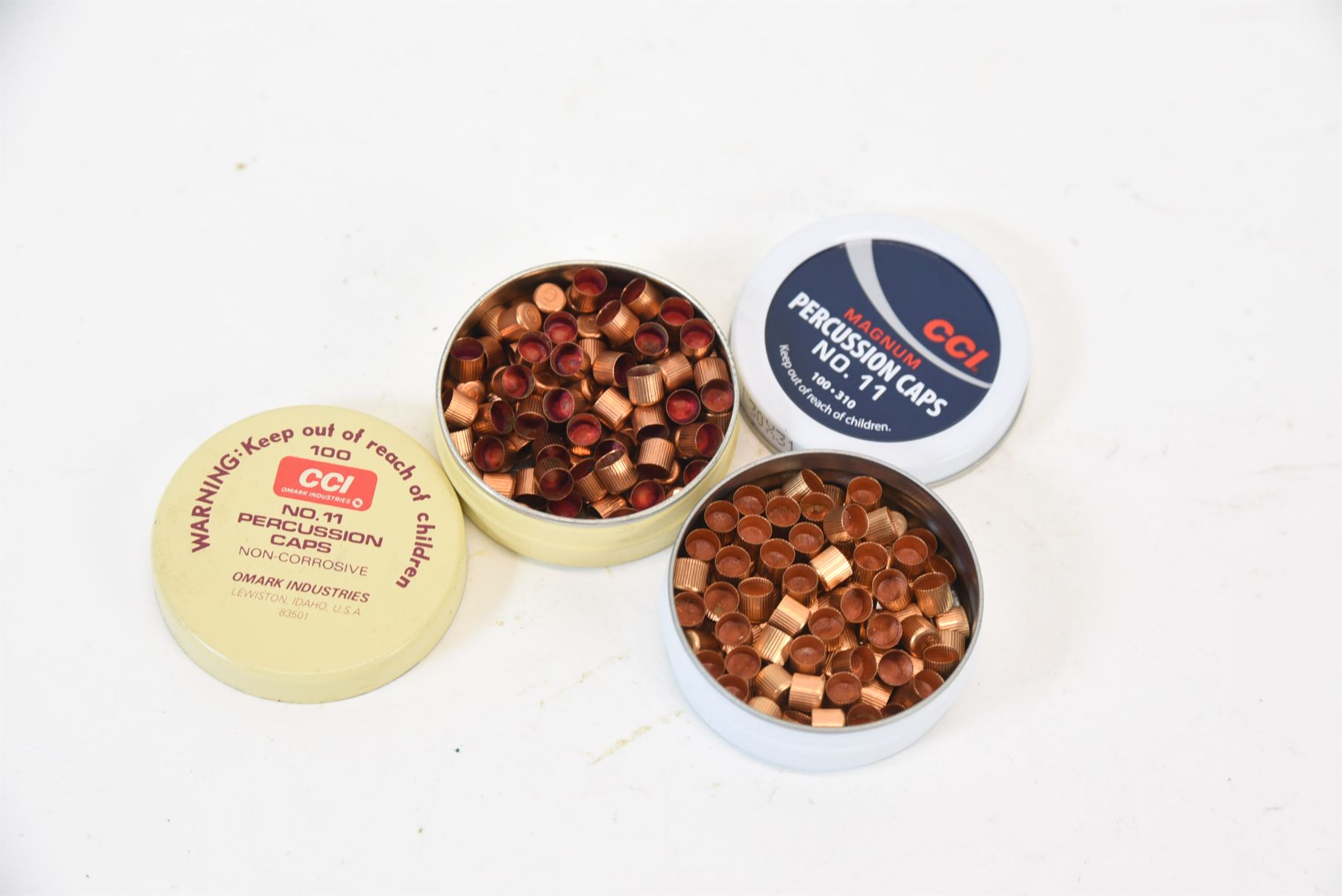White/blue tin has 100 No. 11 magnum percussion caps.