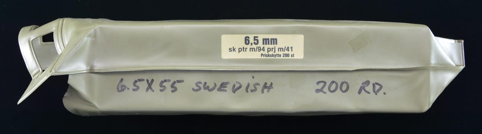 160 GR. SPITZER bullet mfg. for the M41 or M42 Ljungman rifles. CONDITION: battled pack is opened. 1 box is opened showing light corrosion on brass, but appears serviceable. (02-19834-1/MD). $100-175