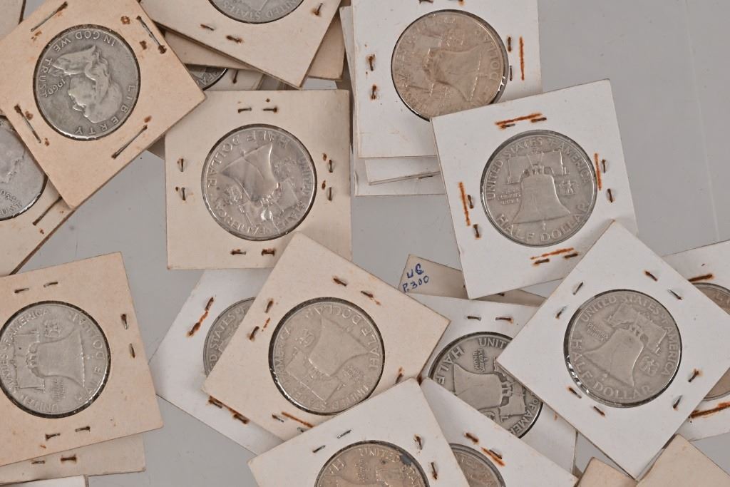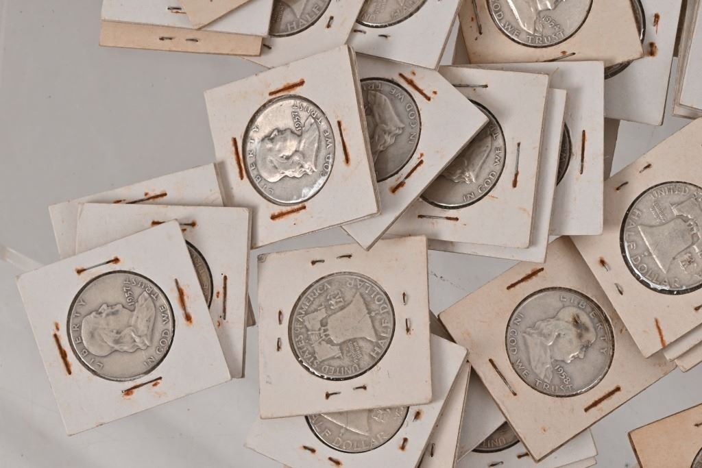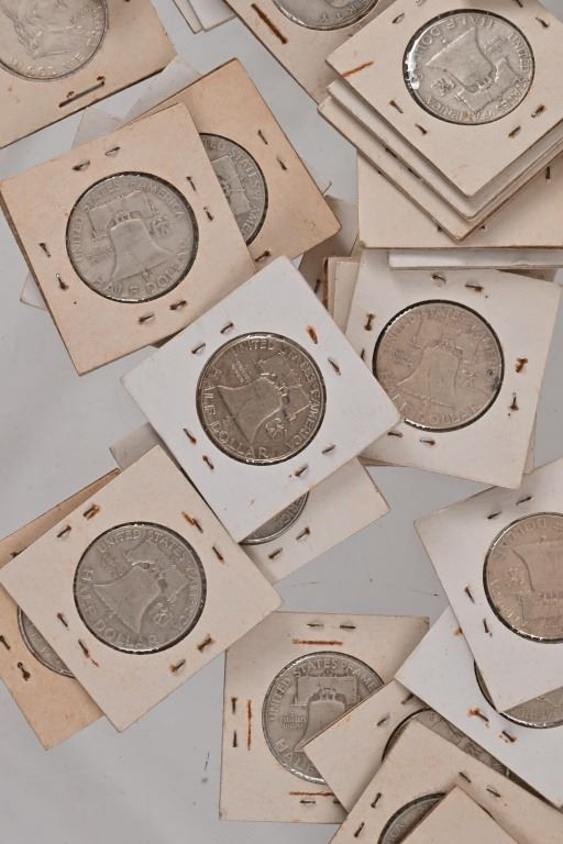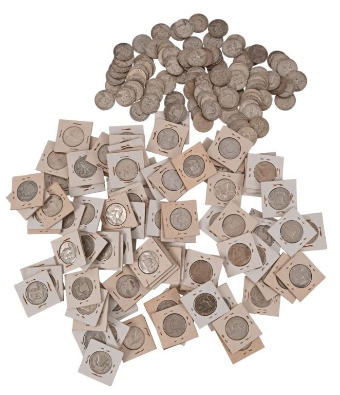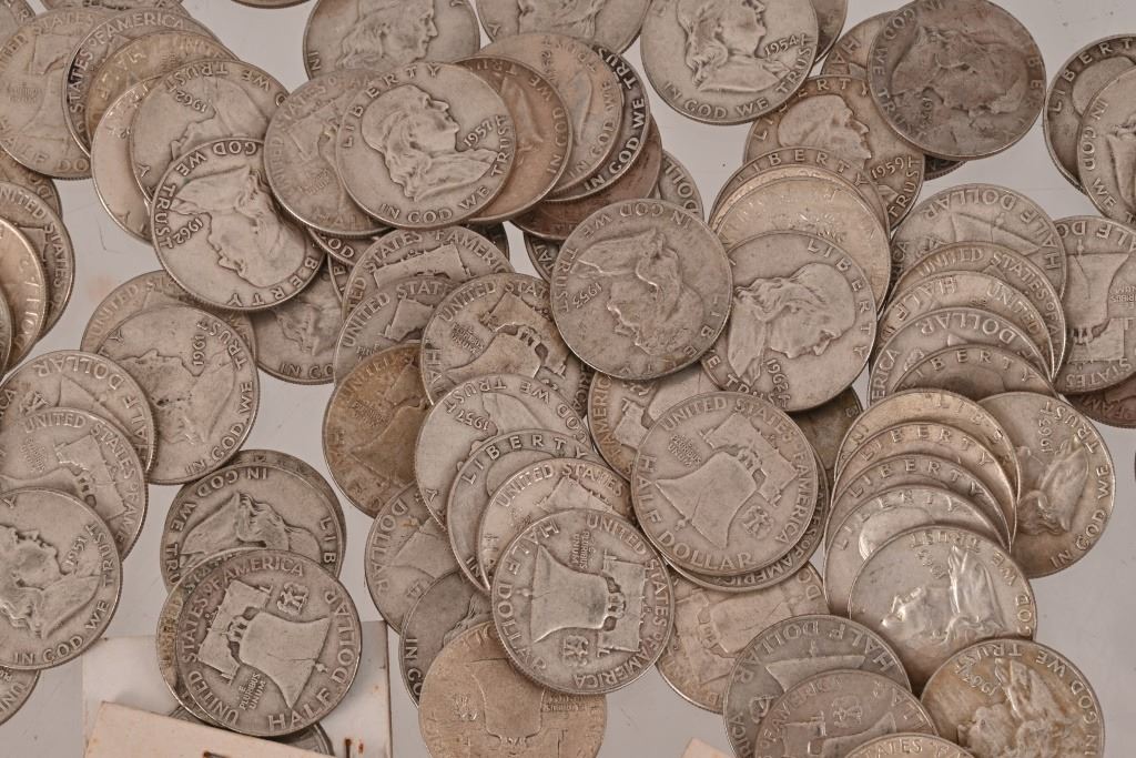 200 silver US half dollars, all pre-1964. (194) Franklin Half Dollars dates ranging from 1949- 1964 excluding 1955. (1) 1941, (1) 1943 and (3) 1945 Walking Liberty Half Dollars along with (2) 1964 Kennedy Half Dollars.