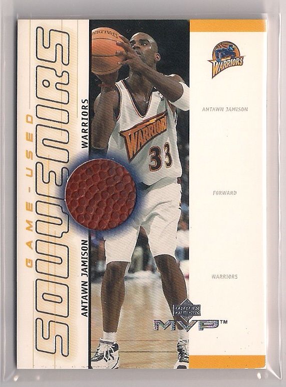 2000-01 Upper Deck kMVP Antawn Jamison Game-Used Ball Insert Card. This Insert features an Authentic piece of Basketball used in a Game by newest Los Angeles Laker forward Antawn Jamision. Card is Near Mint.