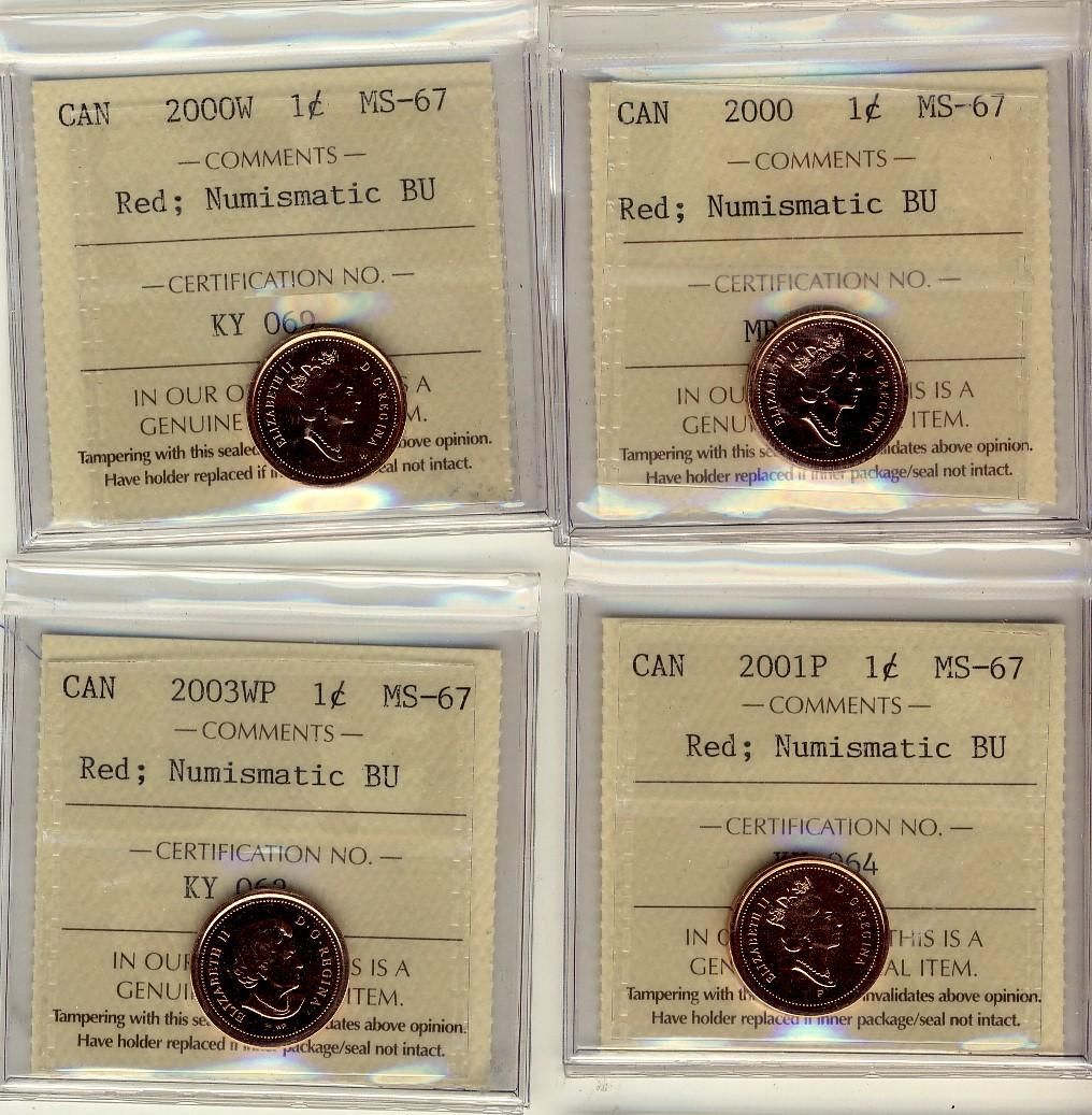 2000 1¢, 2000W, 2001P, 2003WP,, Lot of 4 coins all certified ICCS MS67 Numismatic BU Full Red