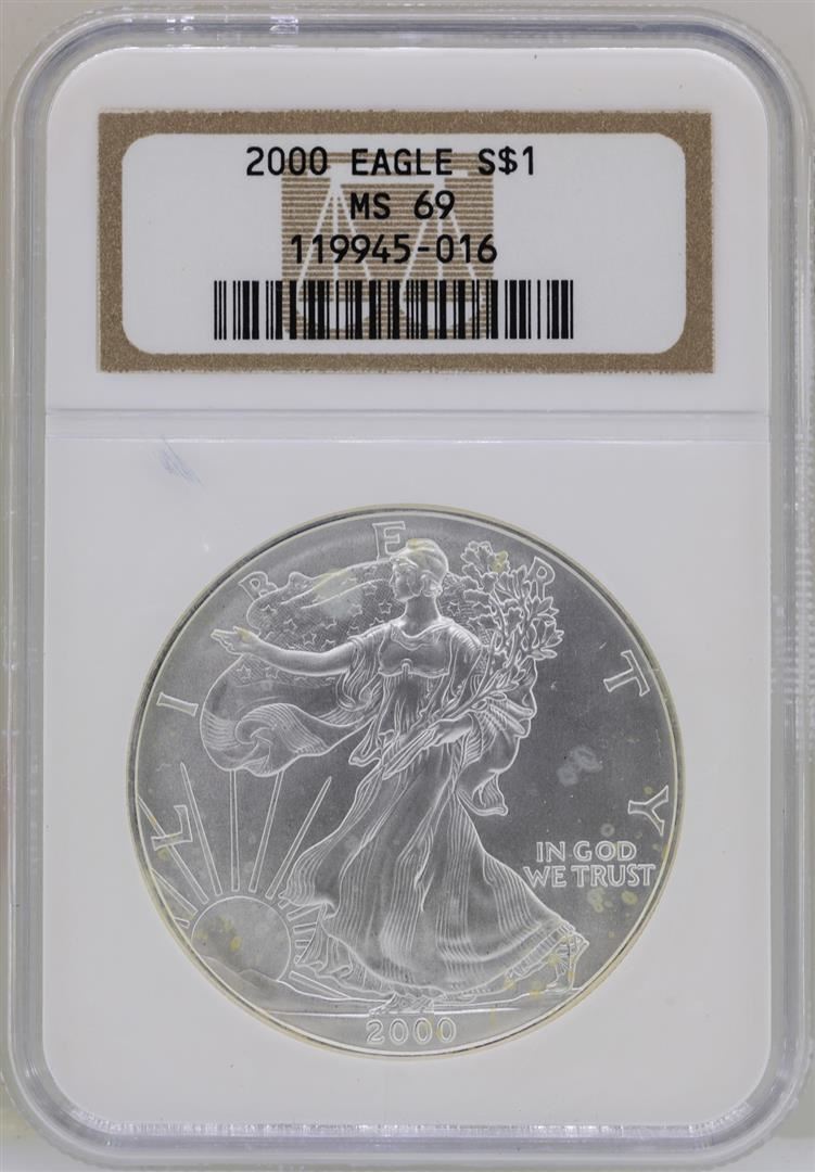 One 2000 $1 American Silver Eagle Coin NGC MS69. NGC Certified.