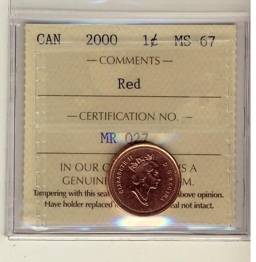 2000 1¢ ICCS MS67 Full Red, A superb GEM example.