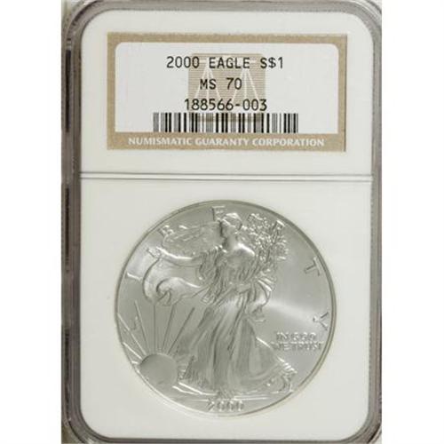 <B>2000 $1 Silver Eagle MS70 NGC.</B></I> NGC Census: (0/0). PCGS Population (0/0). Numismedia Wsl. Price for NGC/PCGS coin in MS70: $700. (#9949)<BR><BR><b>Shipping:</b> Coins & Currency (<a target="_blank" href="http://www.heritageauctions.com/common/shipping.php">view shipping information</a>)