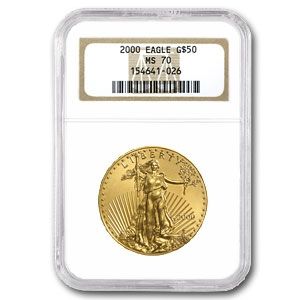 2000 1 oz Gold American Eagle MS-70 NGC **|**|** 2000 1 oz Gold American Eagle MS-70 NGCYear ***2000Grade***Brilliant CirculatedDenomination**50Dim.**32.7Thick:**2.87mm ; MSRP: $6800