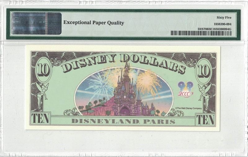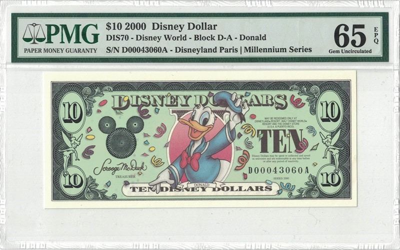 One 2000 $10 Donald Disney Dollar PMG 65EPQ.