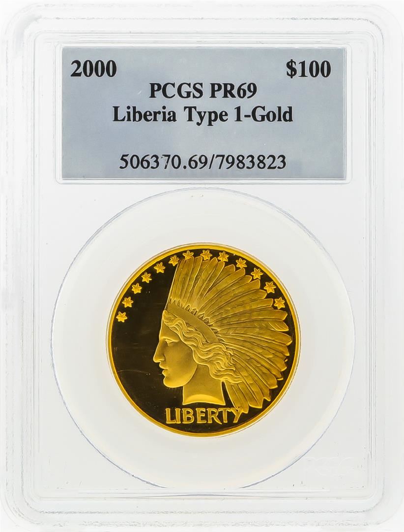 One 2000 $100 Liberia Type 1 Gold Coin PCGS PR69. PCGS Graded.