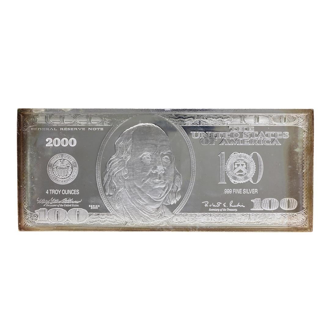 One 2000 $100 Washington Mint 4 oz. .999 Fine Silver Bar.