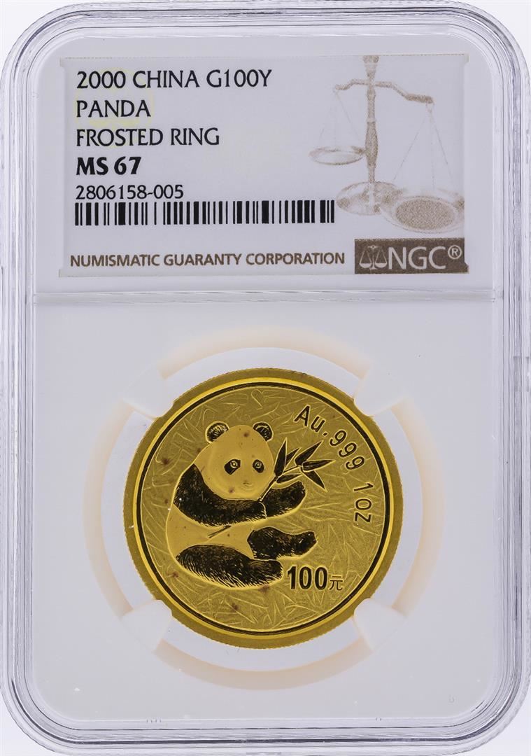 One 2000 100 Yuan China Gold Panda Frosted Ring Coin NGC MS67. NGC Certified.