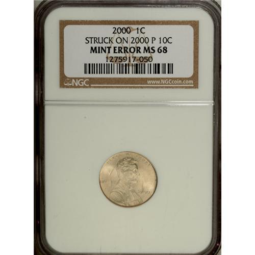 <B>2000 1C Lincoln Cent--Struck on a 2000-P Dime--MS68 NGC.</B></I> Roosevelt's head is nearly fully outlined, and is inverted relative to Lincoln's portrait. The cent date is clear, as is the dime mintmark, but the dime date is effaced by the cent strike. Flames from the torch are present above the cent denomination. Lustrous and lightly toned with good eye appeal.<BR><BR><b>Shipping:</b> Coin/Currency (<a target="_blank" href="http://www.heritageauctions.com/common/shipping.php">view shipping information</a>)