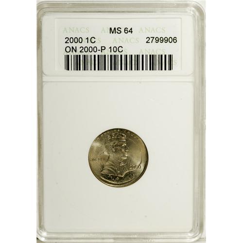 <B>2000 1C Lincoln Cent--Struck on a 2000-P Roosevelt Dime--MS64 ANACS.</B></I> Roosevelt gazes skyward, relative to the Lincoln portrait. Both dates and the dime mintmark are bold. A lustrous double denomination error with light gold toning and refreshingly unabraded surfaces.<BR><BR><b>Shipping:</b> Coin/Currency (<a target="_blank" href="http://www.heritageauctions.com/common/shipping.php">view shipping information</a>)