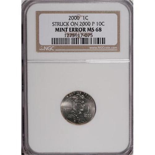 <B>2000 1C Lincoln Cent--Struck on a 2000-P Dime--MS68 NGC.</B></I> This lustrous double denomination error has a hint of gold toning. Roosevelt gazes south-southeast relative to Lincoln's portrait. The flame from the torch flickers near Frank Gasparro's initials. The cent date is sharp, the dime date and mintmark are faint but legible.<BR><BR><B>Coin Engraver:</B> Victor D. Brenner<BR><BR><b>Shipping:</b> Coins & Currency (<a target="_blank" href="http://www.heritageauctions.com/common/shipping.php">view shipping information</a>)