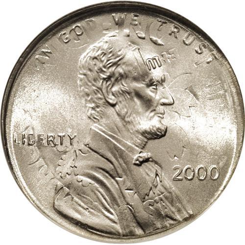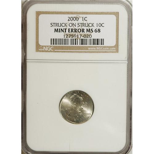 <B>2000 1C Lincoln Cent--Struck on a Struck 10C--MS68 NGC.</B></I> The dime mintmark of this 11 cent piece is apparent near the E in E PLURIBUS UNUM. The dime date is absent, but the cent date is bold. Roosevelt's portrait is inverted relative to the memorial, and the torch flame is present beneath the bowtie.<BR><BR><b>Shipping:</b> Coins & Currency (<a target="_blank" href="http://www.heritageauctions.com/common/shipping.php">view shipping information</a>)