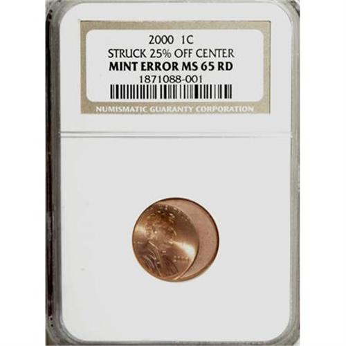 <B>2000 1C Lincoln Cent--Struck 25% Off Center--MS65 Red NGC.</B></I><BR><BR><B>Coin Engraver:</B> Victor D. Brenner<BR><BR><b>Shipping:</b> Coins & Currency (<a target="_blank" href="http://www.heritageauctions.com/common/shipping.php">view shipping information</a>)