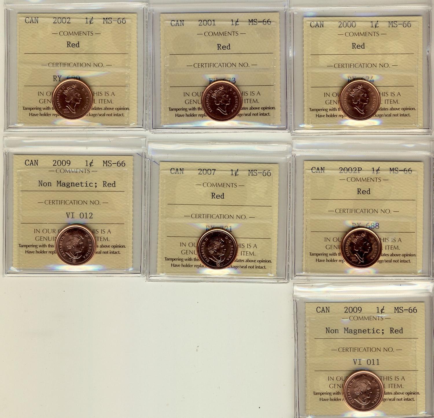 2000,2001,2002,2002P,2007,2009 Non Magnetic(2), 1¢ ICCS MS66 Red L:ot of 6 coins,