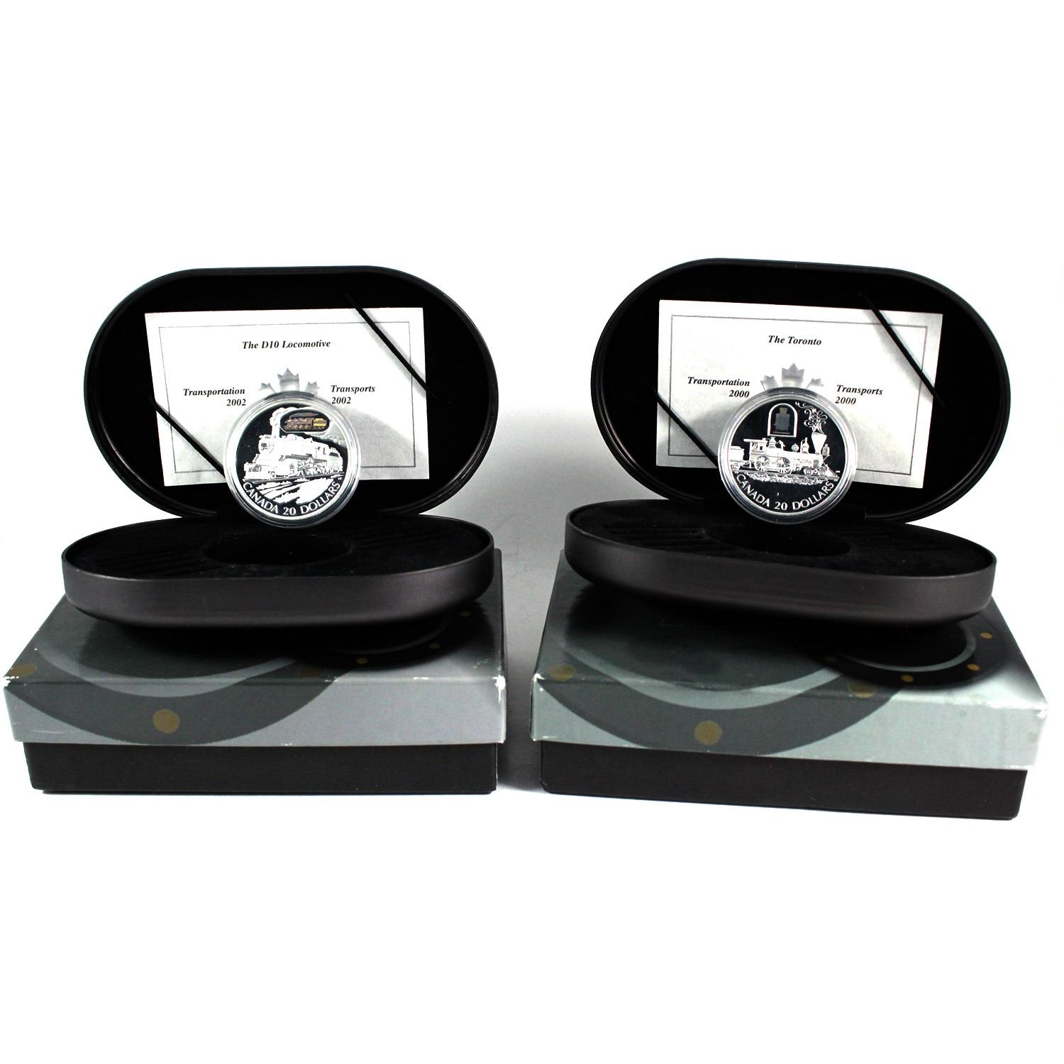 2000 & 2002 Canada $20 Transportation Train Sterling Silver Coins - 2000 The Toronto & 2002 Canadian Pacific D10 (2002 outer box lightly tattered & capsules are scratched). 2pcs