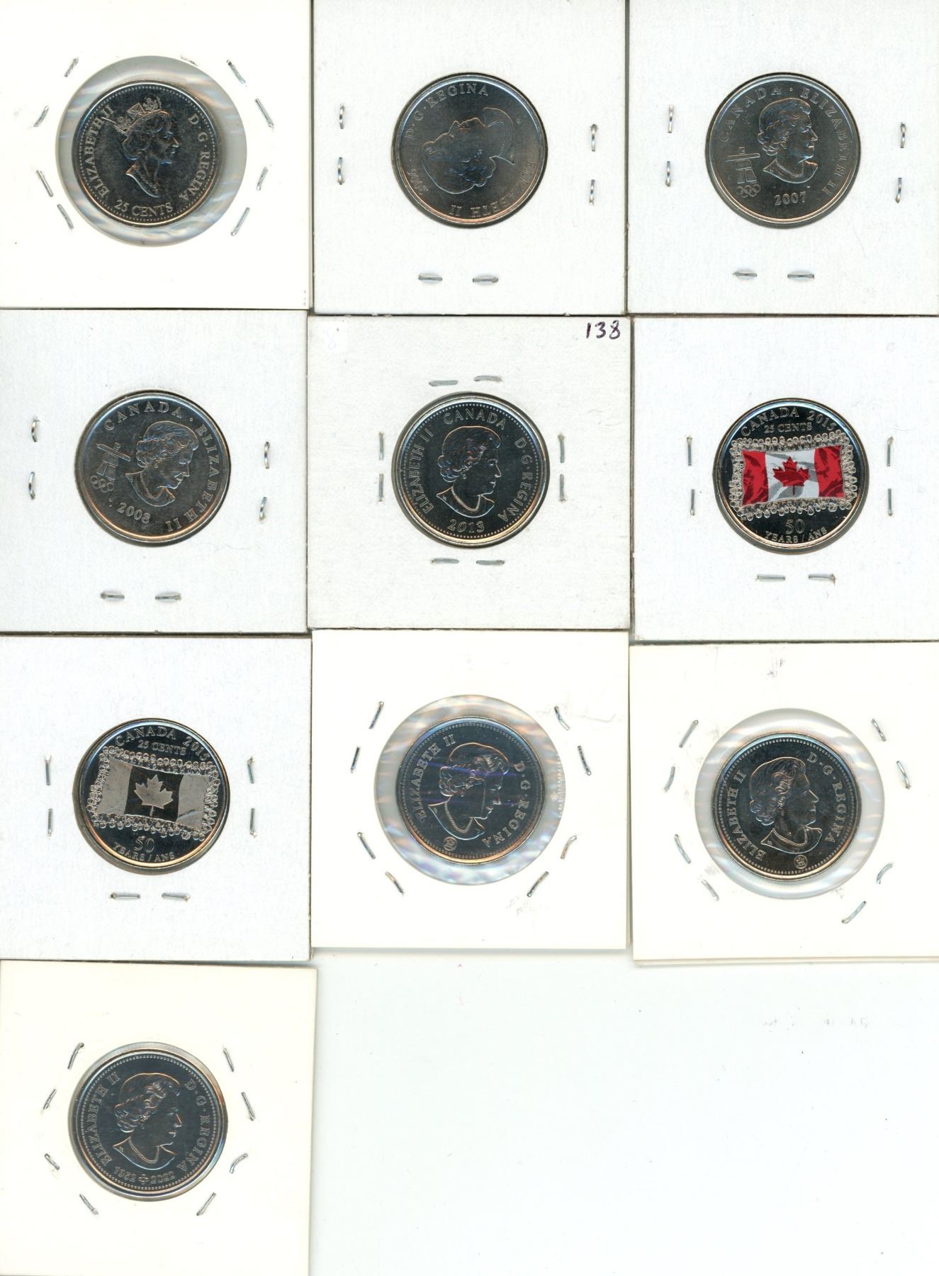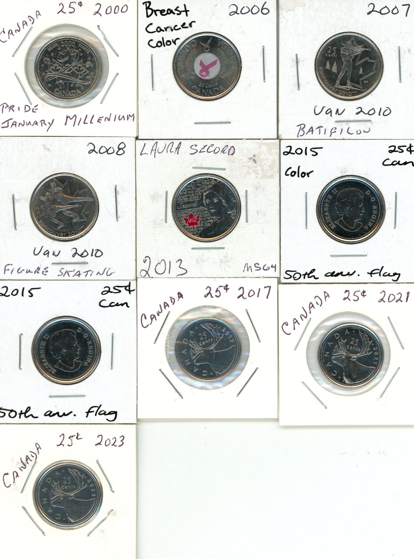 2000, 2006 (Breast Cancer, Color), 2007 (Van. 2010), 2008 (Van. 2010), 2013 (Laura Secord, Color), 2015 (50th Anv. Flag, Color), 2015 (50th Anv. Flag, No Color), 2017, 2021, 2023 Canadian Twenty Five Cents.