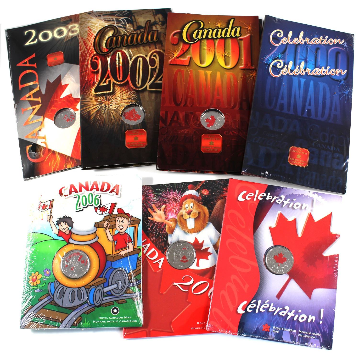 2000-2006 Canada 25-cent Coloured Canada Day Proof Like Coins in Folders. All plastic sealed except 2001 & 2002. 7pcs