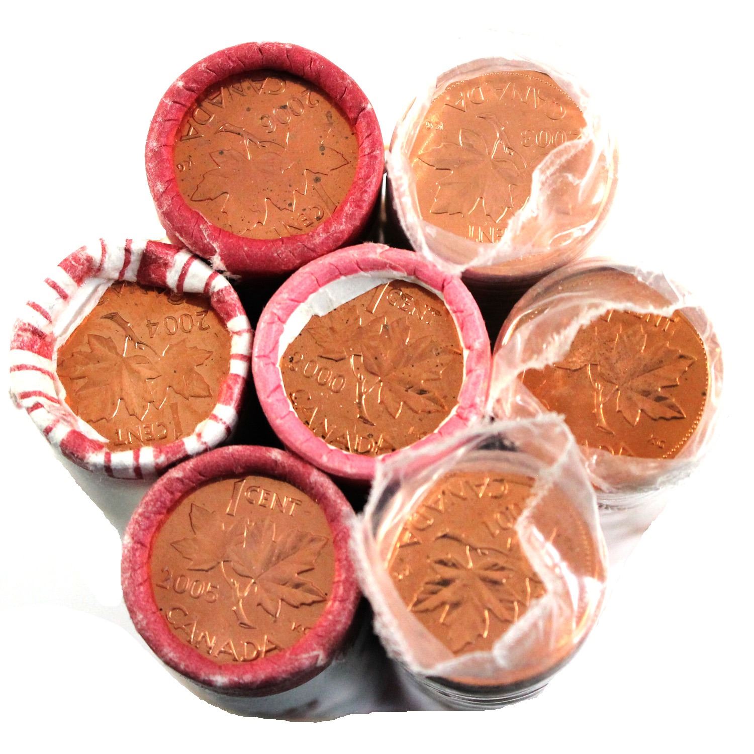 *2000-2006 Canada original wrapped 1-cent roll of 50pcs. Dates include: 2000, 2001 No P, 2002 P OE, 2003 No P OE, 2004P, 2005 No P & 2006 Logo Non-Magnetic. 7 rolls. (Sold as is, no returns)