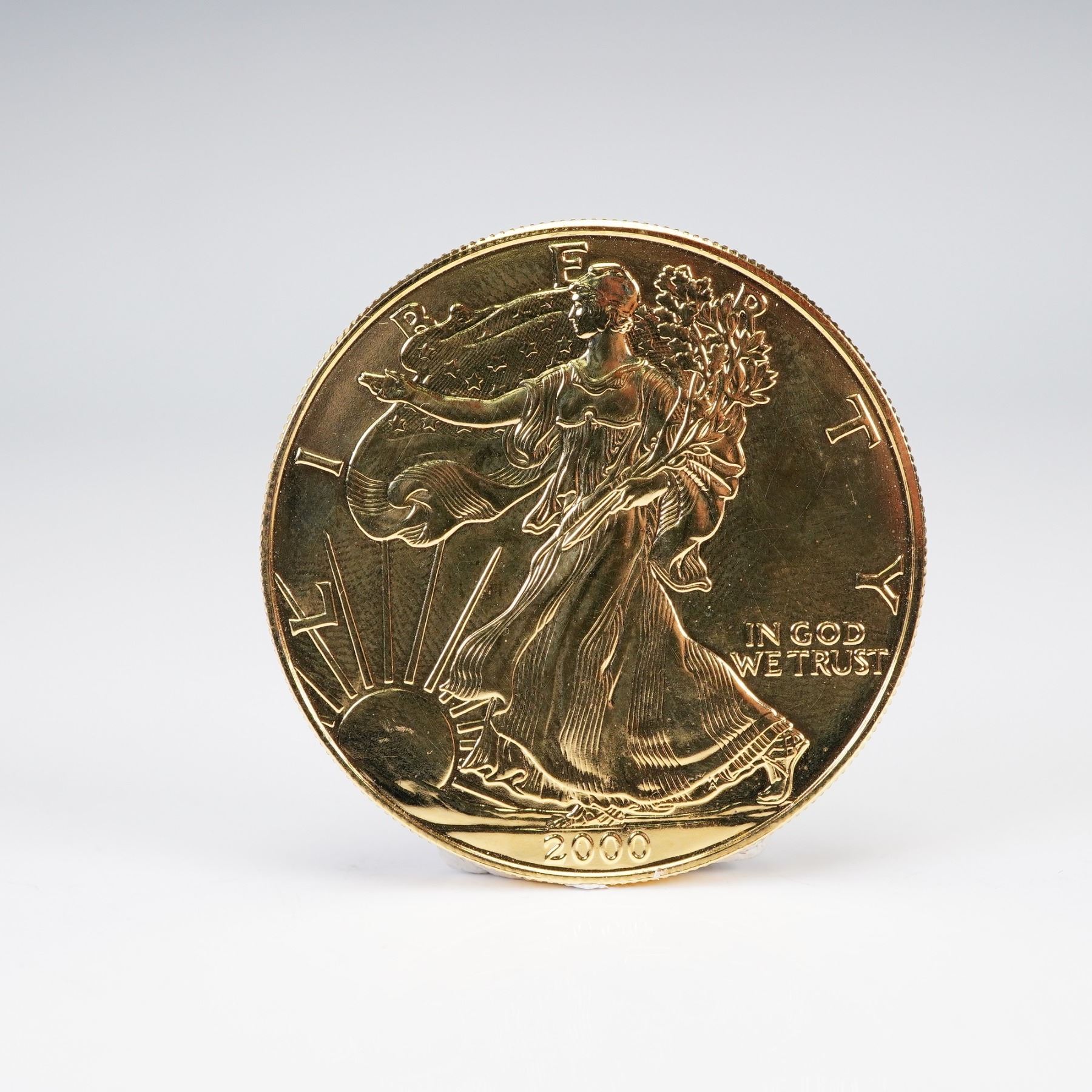 From the Collectors Edition Series. Featuring the Walking Liberty design on the obverse with inscriptions LIBERTY, IN GOD WE TRUST, and the year 2000. The reverse shows a heraldic eagle with shield, olive branch, and arrows, encircled by inscriptions UNITED STATES OF AMERICA, 1 OZ. FINE SILVER, and ONE DOLLAR. Metal Content: One troy ounce of .999 fine silver, 24 karat gold plated. This item has its original box.