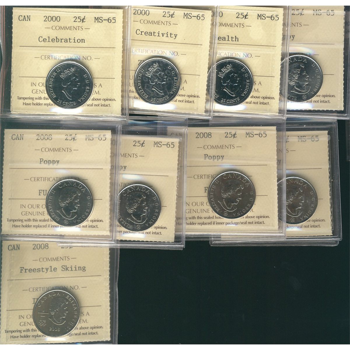 2000 25¢ Celebration, Creativity, Health, 2008 Poppy(5) & Freestyle Skiing all ICCS MS65. Lot of 9 c