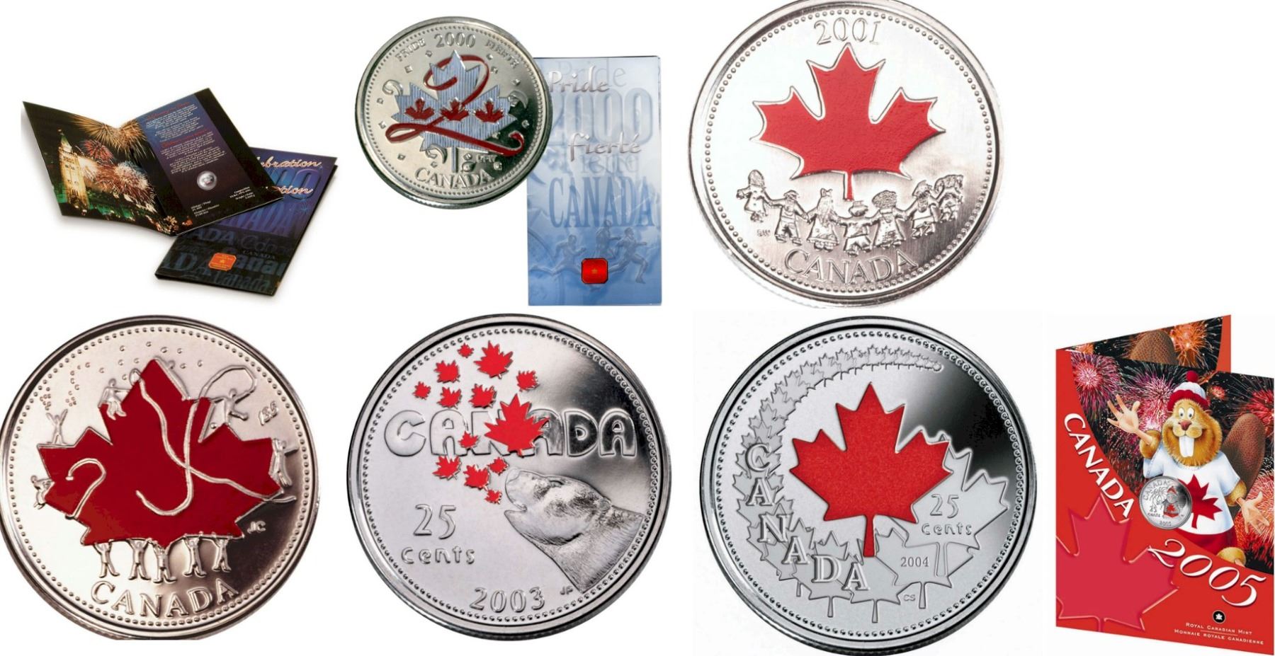 2000 25¢ coloured Celebration, Pride, 2001, 2002, 2003, 2004, and 2005, lot of 7 coins.