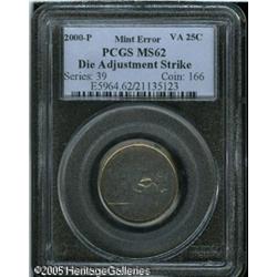 <B>2000-? 25C Virginia Statehood Quarter--Die Adjustment Strike--MS62 PCGS.</B></I> The centers are defined sufficiently to identify the types, while the legends are only partially legible. Although designated on the holder as a Philadelphia Mint example, the mintmark (usually beneath IN GOD WE TRUST) is not visible on this very softly struck example. Upon close inspection, both sides have a few light pinscratches.<BR><I>From The Lonnie Gray Collection of Error Coins.</B></I> Lot:11013