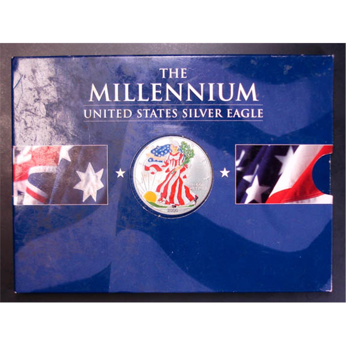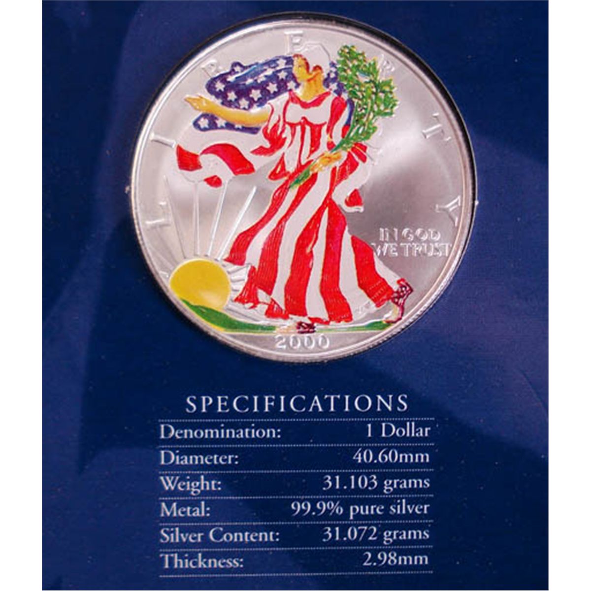 2000 AMERICAN SILVER EAGLE, COLORIZED ON OBVERSE, PACKAGED IN PRESENTATION FOLDE
