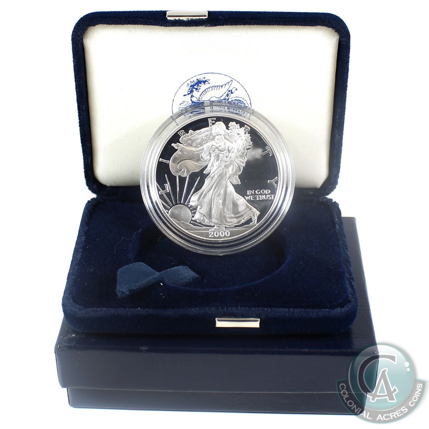 2000 American Eagle 1oz Fine Silver Proof Coin with Display Box and Certificate of Authenticity (Tax Exempt). Scuffed outer box