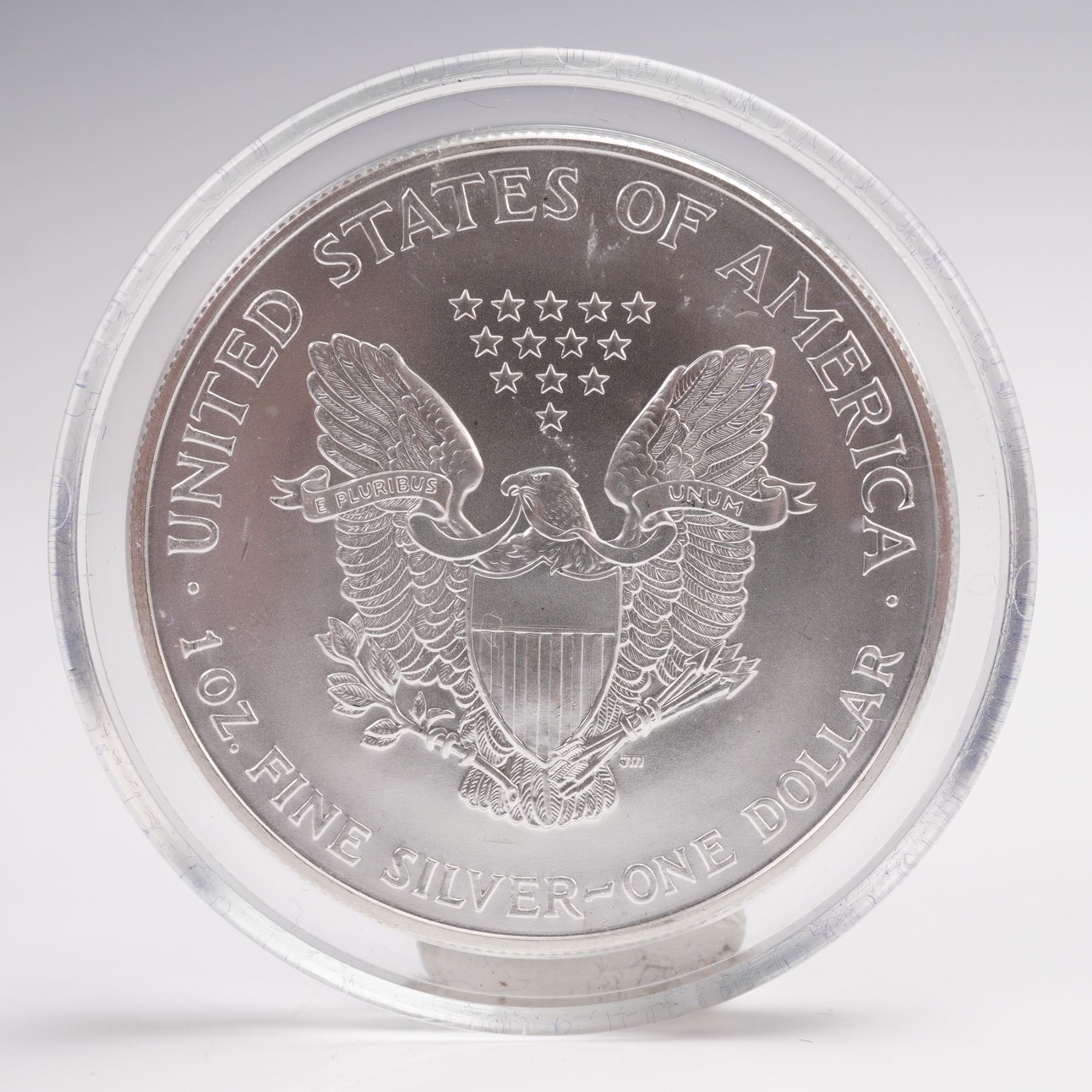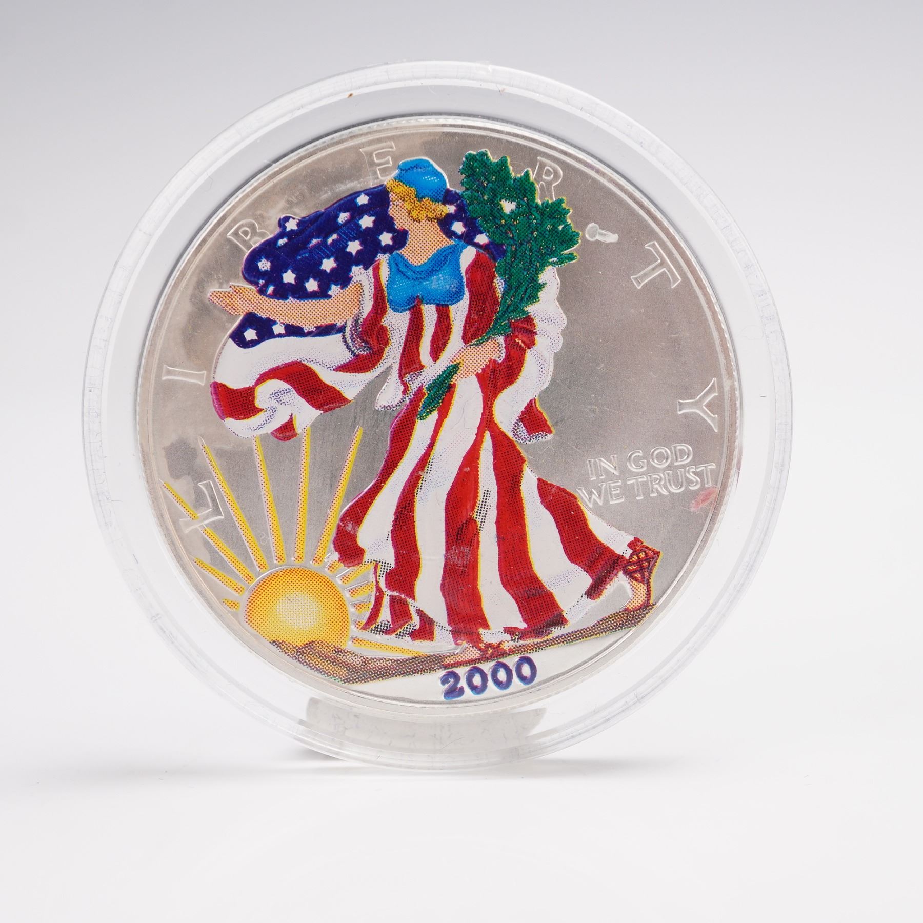 Presented here is a 2000 American Silver Eagle enhanced with a full-color finish. The obverse, designed by Adolph A. Weinman, features Lady Liberty draped in the American flag, walking toward the rising sun, accompanied by the inscriptions LIBERTY, IN GOD WE TRUST, and the date 2000. The reverse, by John Mercanti, shows the heraldic eagle with shield, olive branch, and arrows, beneath thirteen stars, and the inscriptions UNITED STATES OF AMERICA, 1 OZ FINE SILVER, and ONE DOLLAR. This coin is struck from one troy ounce of .999 fine silver and remains encapsulated in a clear protective holder. It comes housed in a fitted case.