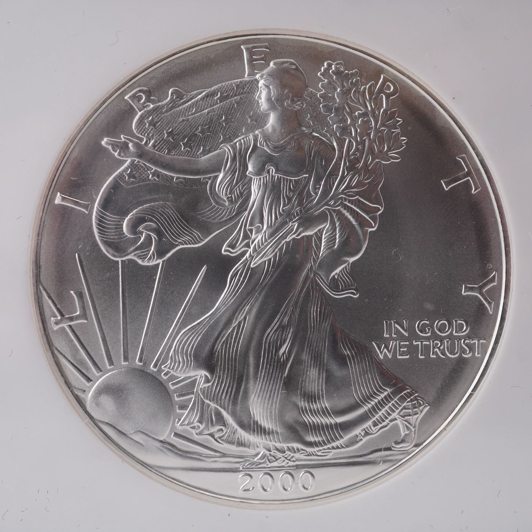 A 2000 American Silver Eagle Dollar graded MS69 by the Numismatic Guaranty Corporation (NGC). Struck in one troy ounce of .999 fine silver, this iconic coin showcases Adolph A. Weinman's celebrated Walking Liberty design on the obverse and John Mercanti's heraldic eagle with shield on the reverse. The coin gleams with exceptional luster and crisp detail, preserved in near-perfect Mint State 69 condition, housed securely in its holder. Slabbed by NGC.