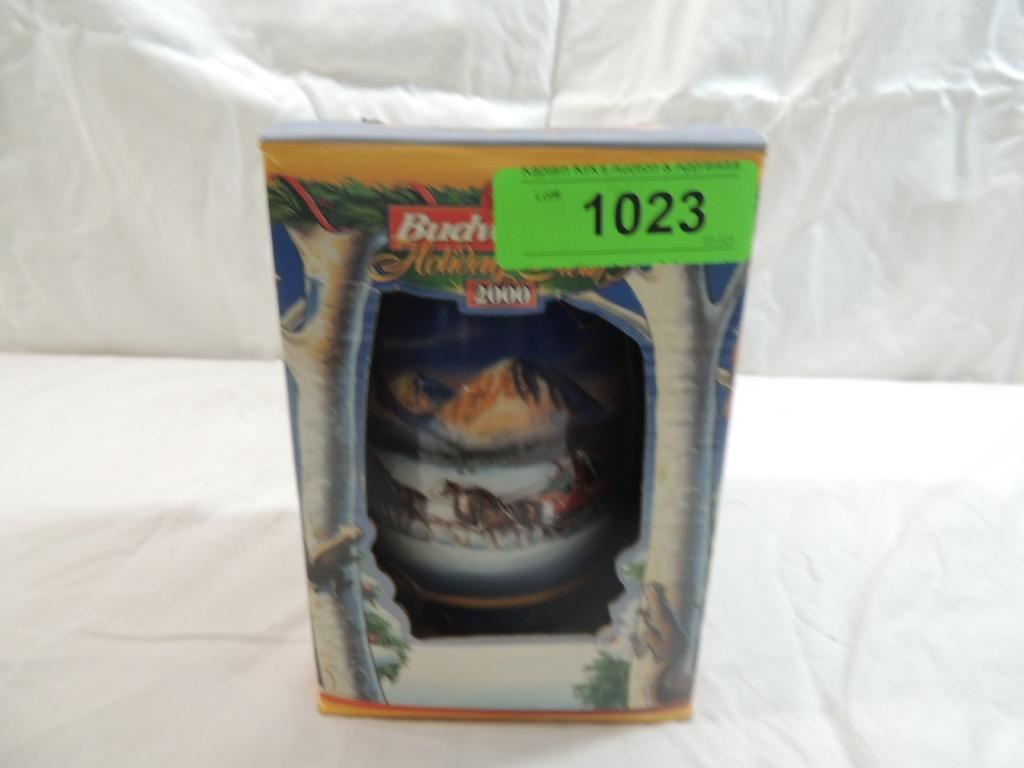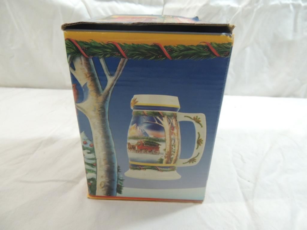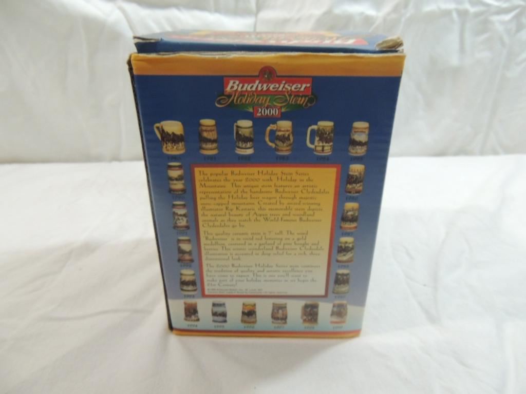BUDWEISER HOLIDAY STEIN, 2000 BUDWEISER COLLECTORS STEIN, IN ORIGINAL BOX, LIMITED EDITION STEIN, YEARLY STEIN, BEER COLLECTIBLE, BUDWEISER COLLECTORS STEIN, AS SHOWN SEE PHOTO FOR MORE DETAILS.