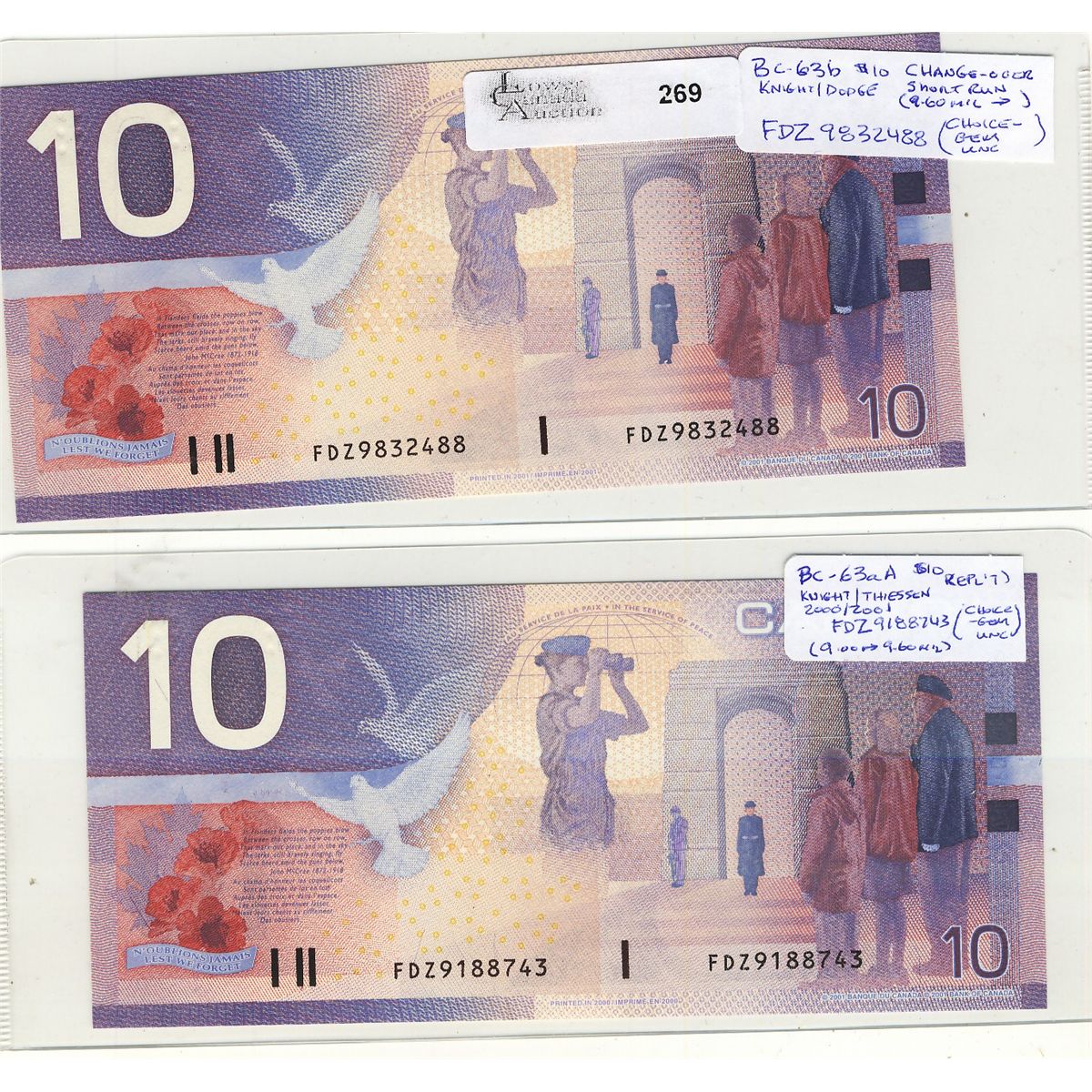 2000 Bank of Canada; 10 Dollars BC-63aA #FDZ9188743 & BC-63b #FDZ9832488. Lot of 2 notes UNC.